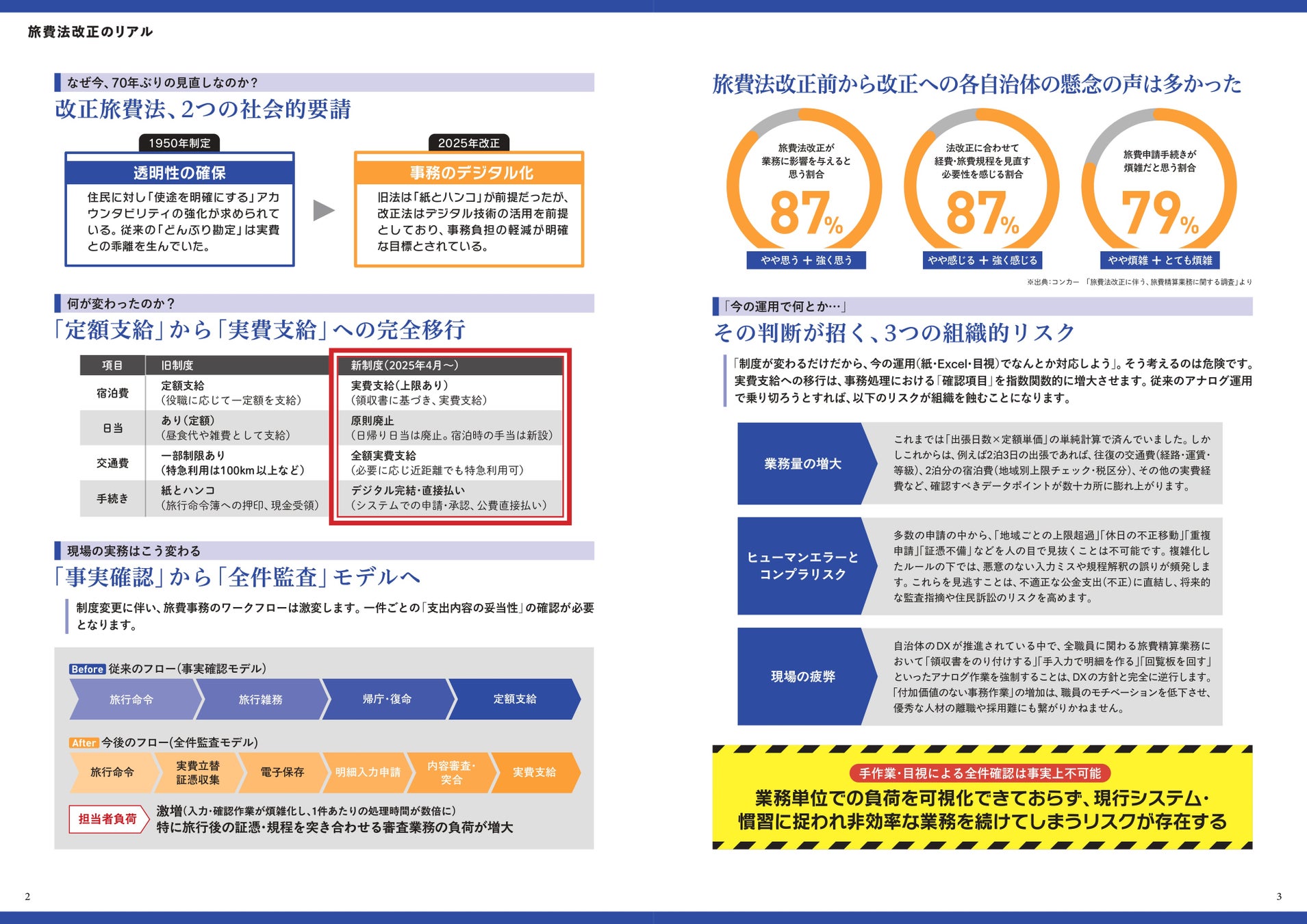1950年の制定から約70年ぶりとなる旅費法の見直しにより、2025年4月から国家公務員の旅費支給は従来の「定額支給」から領収書に基づく「実費支給(上限あり)」へと移行しています。この法改正は各自治体の旅費規程にも大きな影響を与え、確認すべきデータポイントの急増による「業務量の増大」や「ヒューマンエラーとコンプラリスク」の発生など、現場の疲弊が懸念されています。