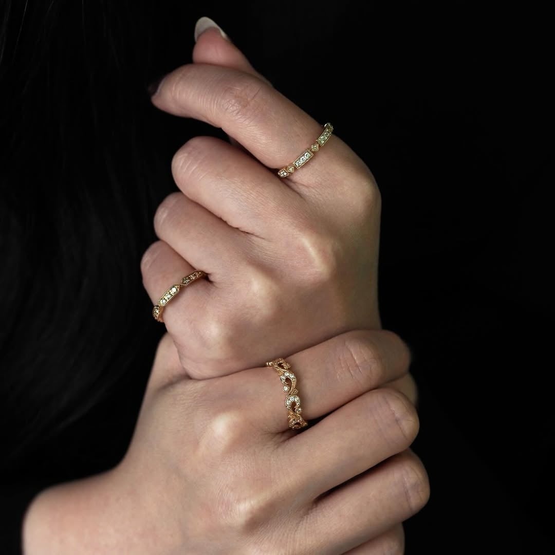 ストレートシルエットのリングには、スクエアやマーキースなど幾何学的な形を反復し、ゴシック建築を思わせる厳かで普遍的な美しさを映しました。唐草模様をモチーフにしたウェーブタイプは、指先にしなやかに沿い、自然の揺らぎを思わせる優美な曲線を描きます。同じシリーズの中に意匠の幅があることも、Mille Gothiqueの魅力のひとつです。