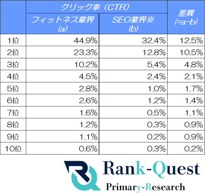 SEO対策支援実績4,300社超のランクエスト(https://rank-quest.jp/column/column/how-to-seo/ )は、2025年9月にフィットネス業界のクライアントサイトを対象とした「検索順位ごとのクリック率(CTR)」の調査を実施しました。