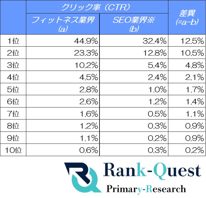 今回の調査では、検索結果上位10位にランクインした2,987件のフィットネス関連キーワードを分析対象とし、順位によるCTRの変動を詳細に検証。加えて、ランクエストが運用するSEO業界向けメディア(注)のクリック率データとも比較し、検索ユーザーの行動傾向とそこから導かれるSEO対策の方向性を明らかにしています。