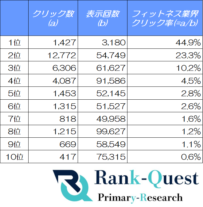 https://rank-quest.jp/column/column/how-to-seo/ SEO対策支援実績4300社のランクエストがフィットネス業界における検索順位毎のクリック率を徹底解説!