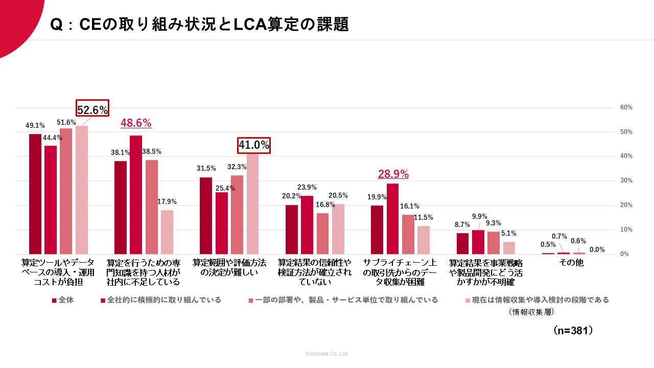「先進企業層(全社的に積極的に取り組んでいる)」では、「専門知識を持つ人材が社内に不足(48.6%)」、「算定ツールやデータベースの導入・運用コストが負担(44.4%)」が1・2位。続いては「サプライチェーン上の取引先からのデータ収集が困難(28.9%)」となり、これは他の層と比べて高い傾向になっている