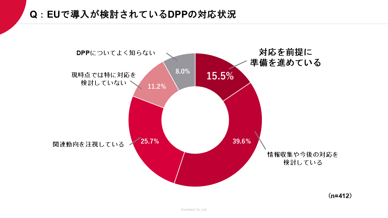 ⑤欧州で進むDPP(デジタル製品パスポート)への対応準備が進む企業は、15.5%に留まり、情報収集や動向注視の企業が7割近い結果となった。また、海外売上比率10%を超える企業は「対応を前提に準備を進めている」の割合が高くなる傾向が見られ、海外取引との関連性がうかがえる結果となった(※3)