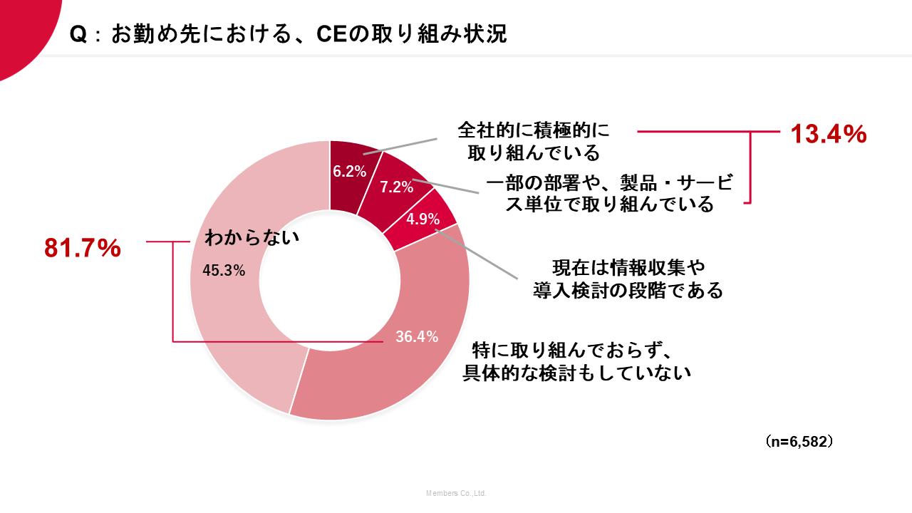 「全社的に積極的に取り組んでいる(6.2%)」「一部の部署や、製品・サービス単位で取り組んでいる(7.2%)」を合わせると13.4%にとどまる。また、「特に取り組んでおらず、具体的な検討もしていない(36.4%)」と「わからない(45.3%)」の合計が81.7%。多くの企業で取り組みが進んでいない実態が明らかになった