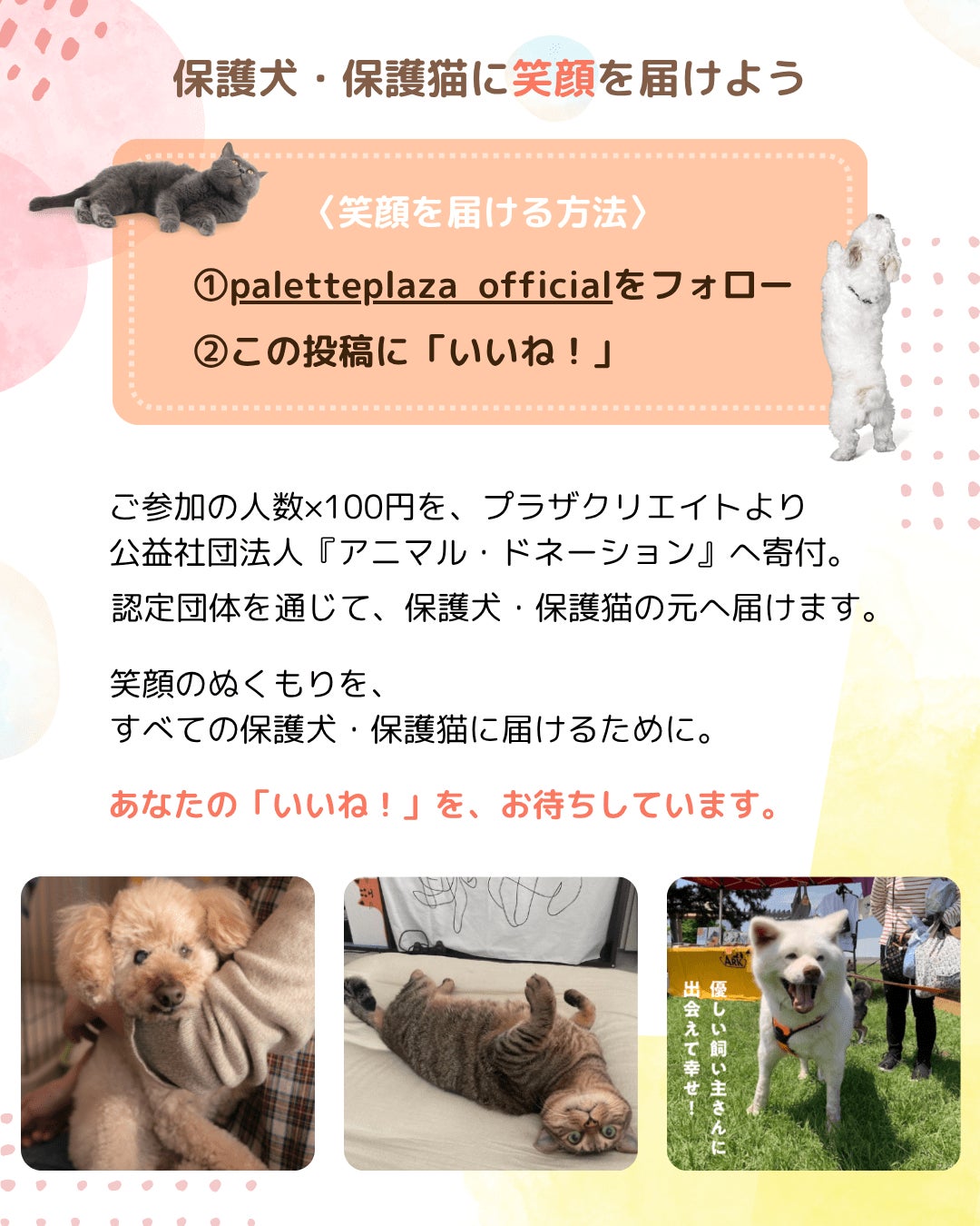 1投稿ごとに100円を、プラザクリエイトがアニドネへ寄付します。寄付金は、認定団体を通じて保護動物たちのために活用されます。