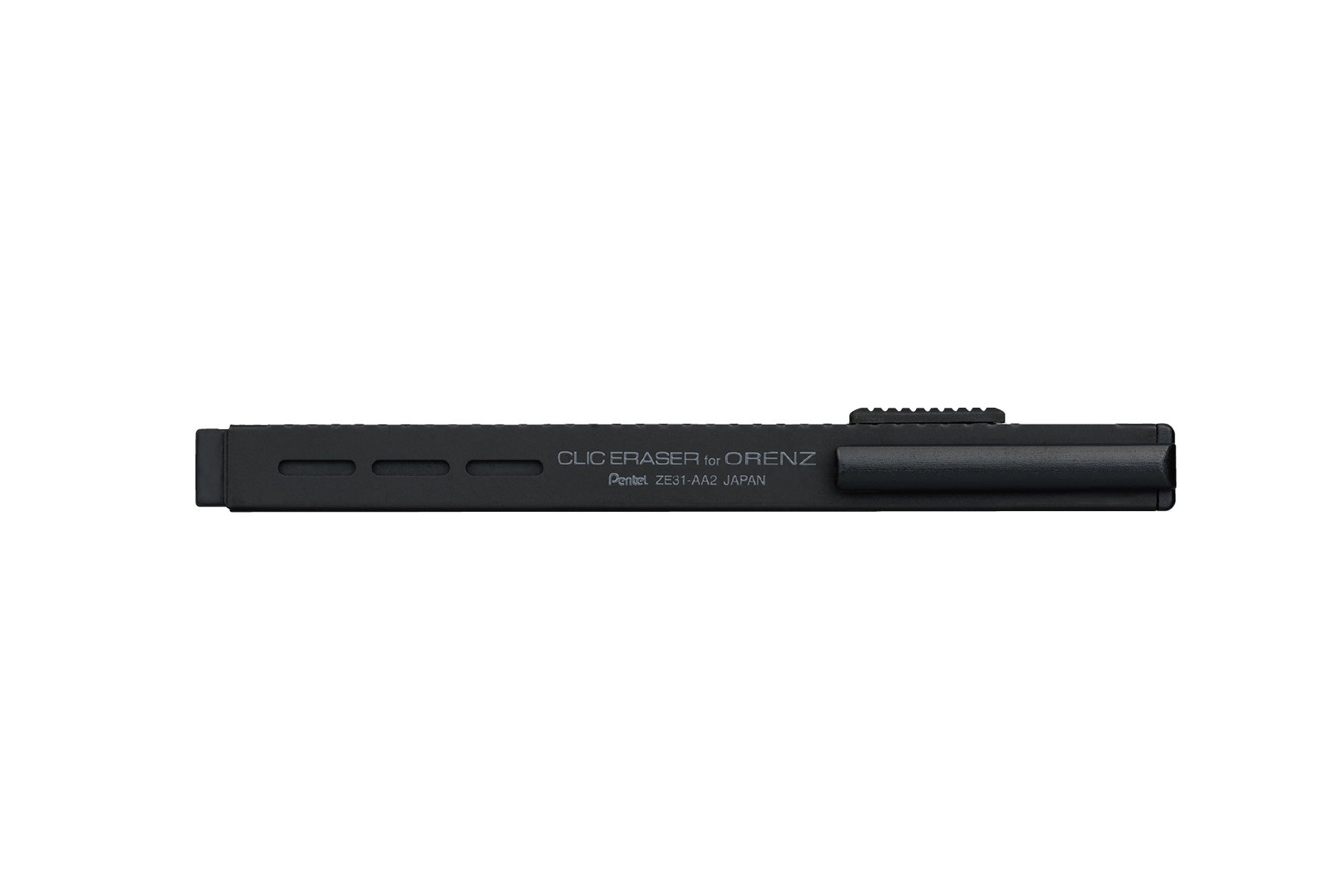 今回の限定セットには、オレンズネロのために作られた限定の金属製替芯ケースとホルダー式消しゴムを同梱しています。金属製替芯ケースは、オレンズネロのデザインコンセプトである、“塊から削り出したような一体感”を追求し、ぺんてるの自動芯出し機構搭載のシャープペンシルのアイデンティティを継承した、重厚感のある12角柱のフォルムに仕上げました。ホルダー式消しゴムは「CLIC ERASER for ORENZ」というロゴ印字に加え、消しゴム本体の色を黒に統一した特別仕様になっています。どちらもオレンズネロが持つ世界観に馴染むデザインです。