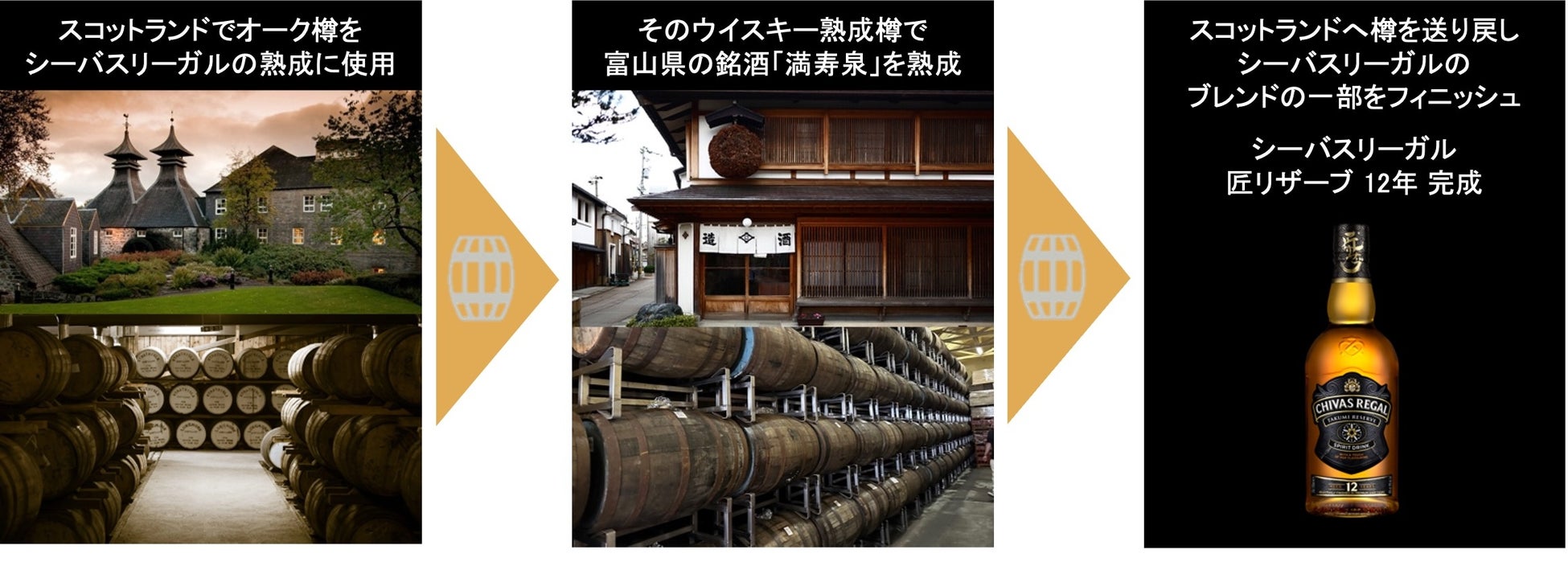 『シーバスリーガル 匠リザーブ 12年』で用いた“日本酒カスク”は、スコットランドと日本(富山県)を往復することで作り出されます。まず、シーバスリーガルのウイスキー熟成に使用したオーク樽をスコットランドから日本に送り、富山県の桝田酒造店で銘酒「満寿泉」を寝かせます。その特別な樽を再度スコットランドへ送り戻し、12年以上熟成した「シーバスリーガル」のブレンドの一部をフィニッシュしています。この“日本酒カスク”でフィニッシュした製法は、スコッチウイスキーでは前例のない、革新的な試みです。