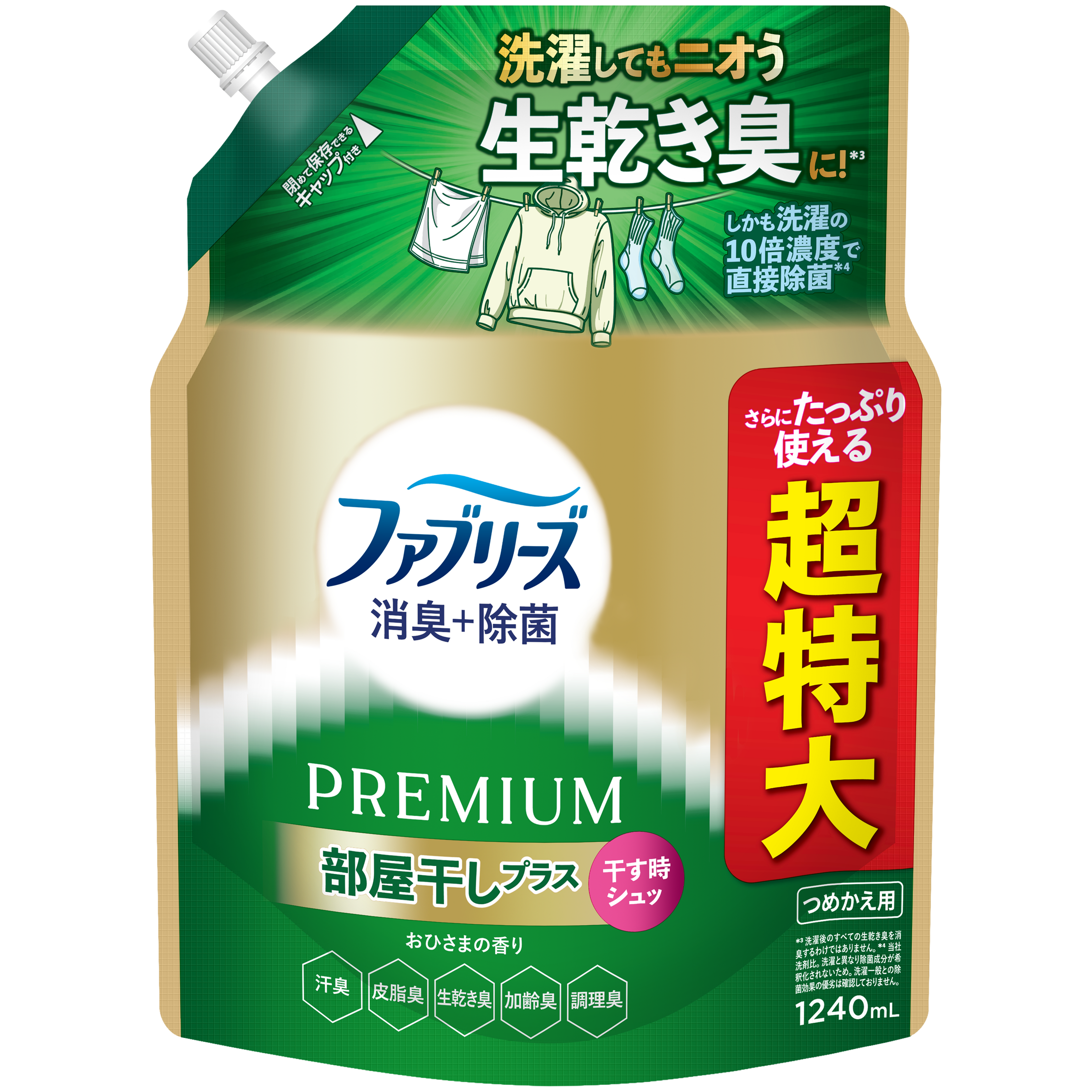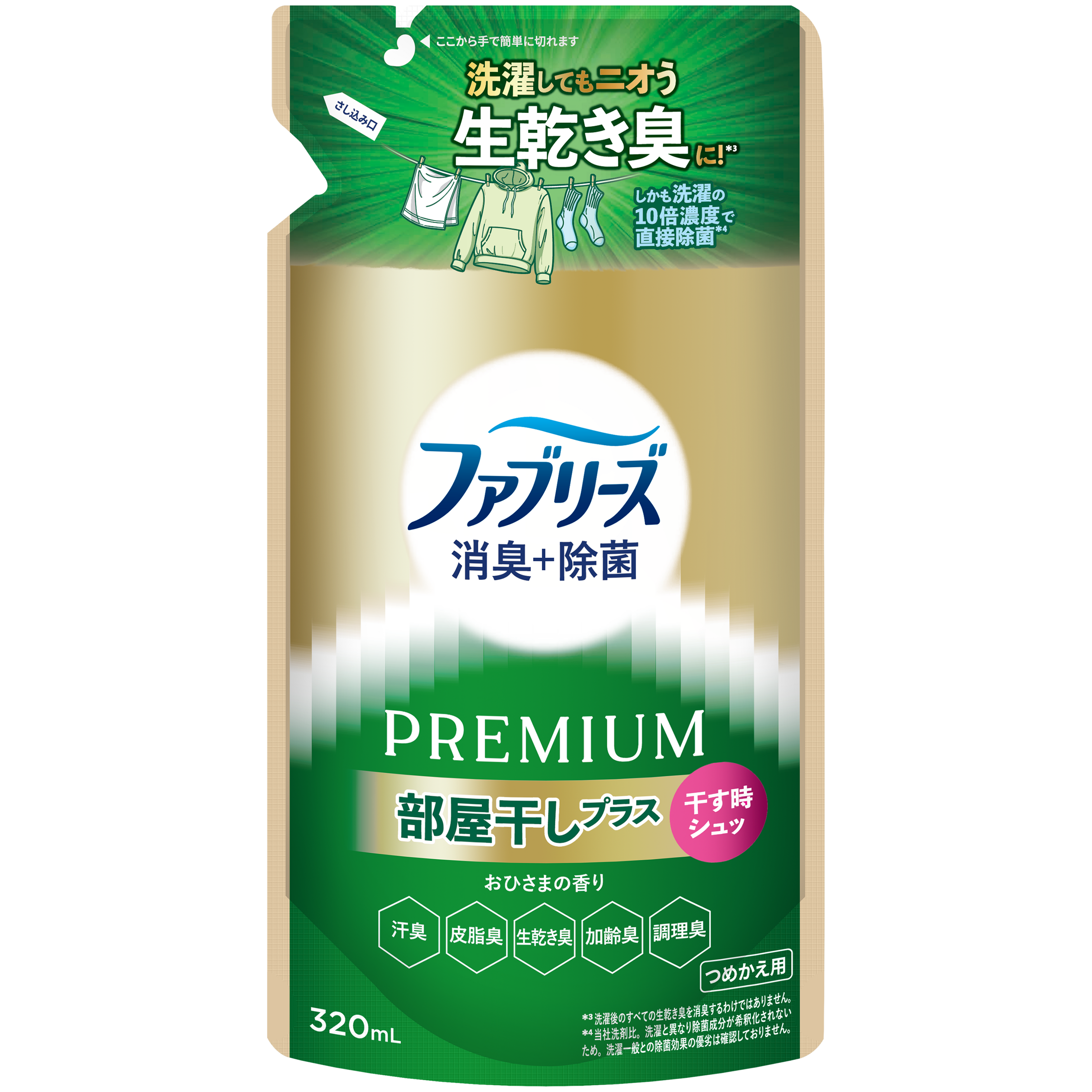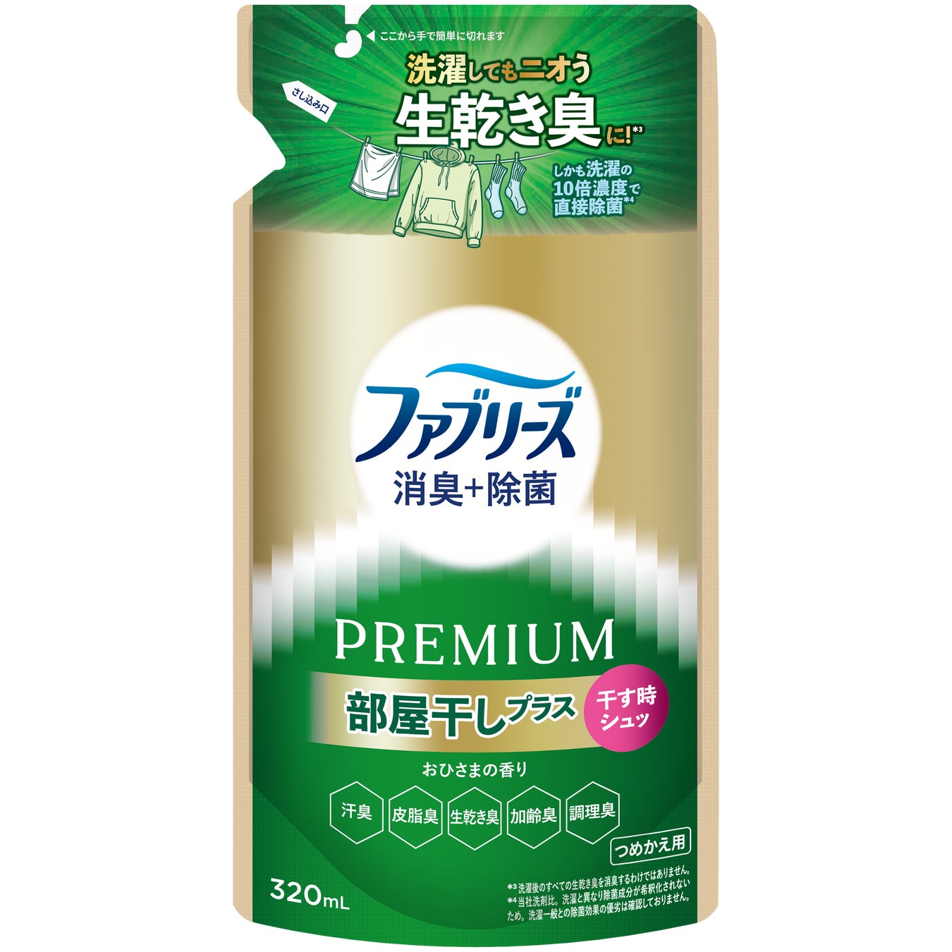 今回発売する「ファブリーズ 消臭+除菌プレミアム 部屋干しプラス」は、部屋干し時に洗濯物へスプレーするという新しい使い方を提案。干すときにシュッとするだけで生乾き臭を消臭*¹し、快適な部屋干し習慣をサポートします。