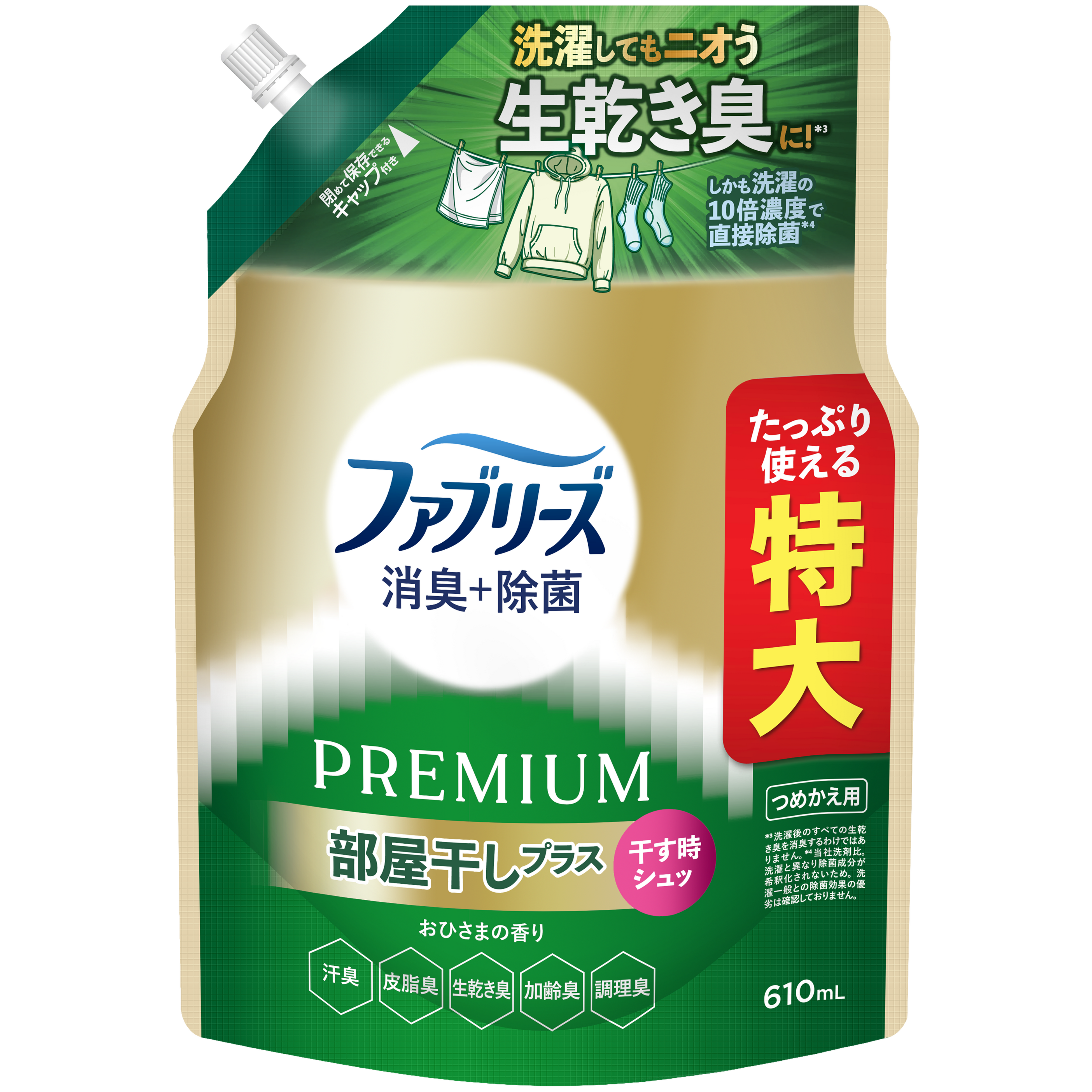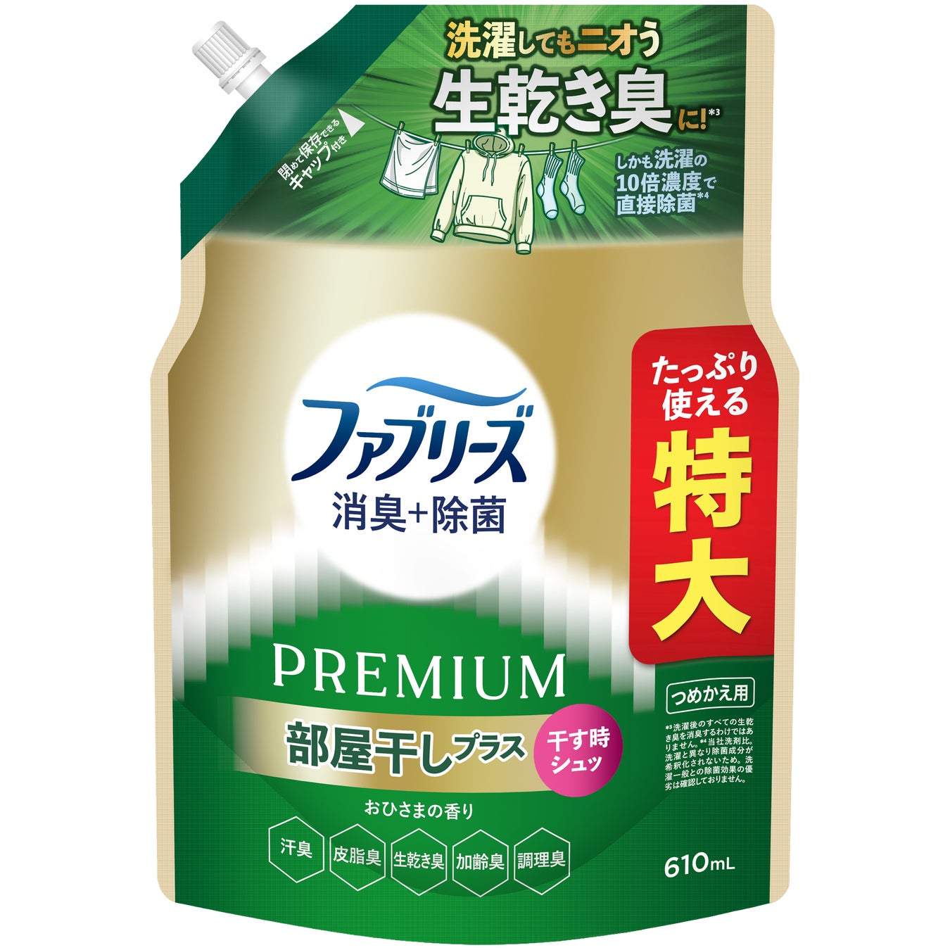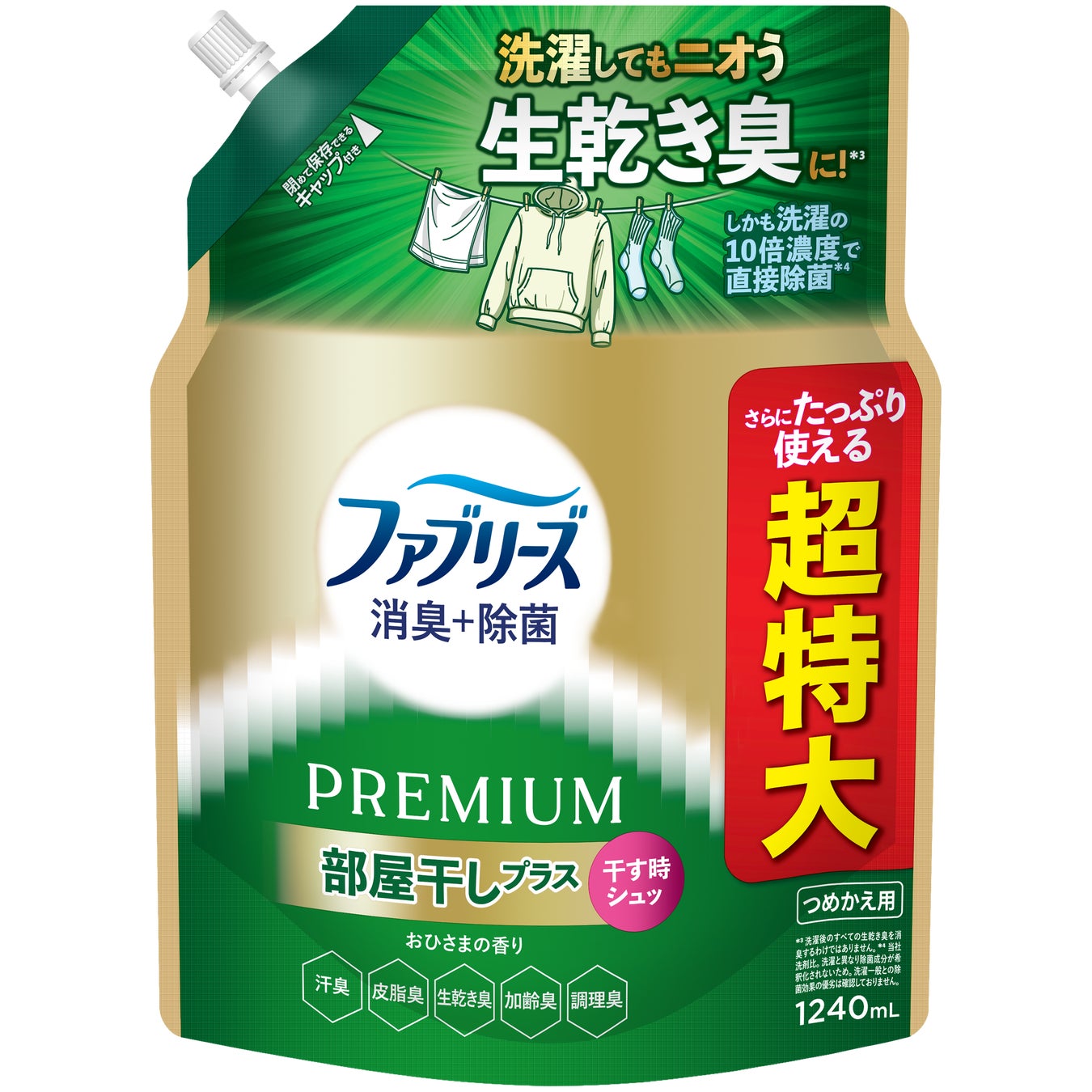 今回発売する「ファブリーズ 消臭+除菌プレミアム 部屋干しプラス」は、部屋干し時に洗濯物へスプレーするという新しい使い方を提案。干すときにシュッとするだけで生乾き臭を消臭*¹し、快適な部屋干し習慣をサポートします。