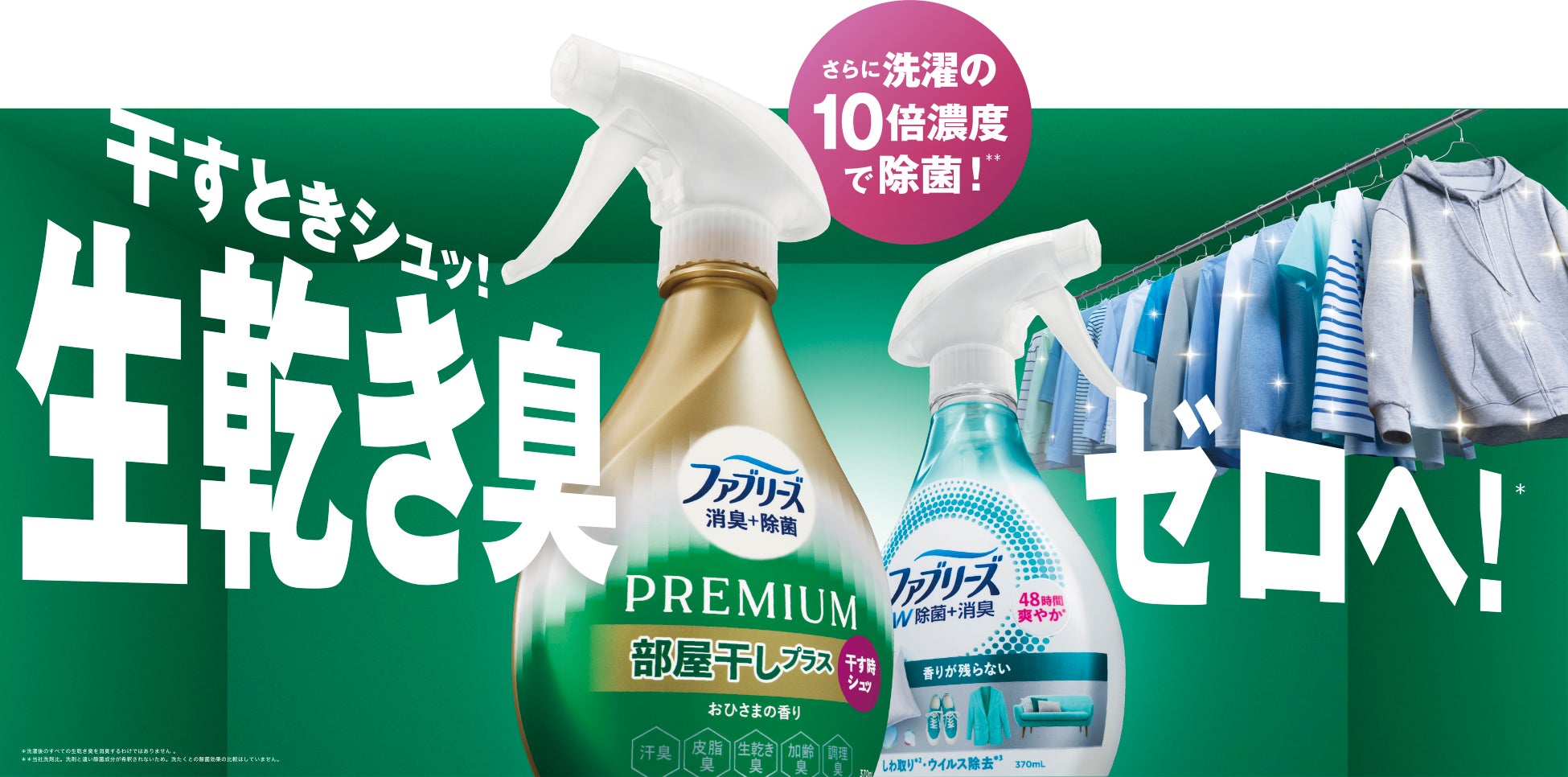「ファブリーズ 消臭+除菌プレミアム 部屋干しプラス」新発売! 部屋干しの生乾き臭対策に新習慣。干すときにシュッ!で生乾き臭ゼロへ。