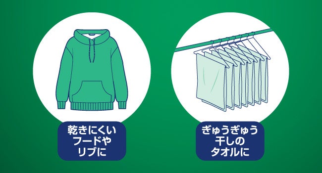 部屋干しの際、フードの襟元や脇部分など乾きにくくニオイが発生しやすい箇所に、直接・部分的にスプレーすることができます。洗濯物を部屋干しする時にシュッとひと吹きするだけで、生乾き臭を消臭*¹します。