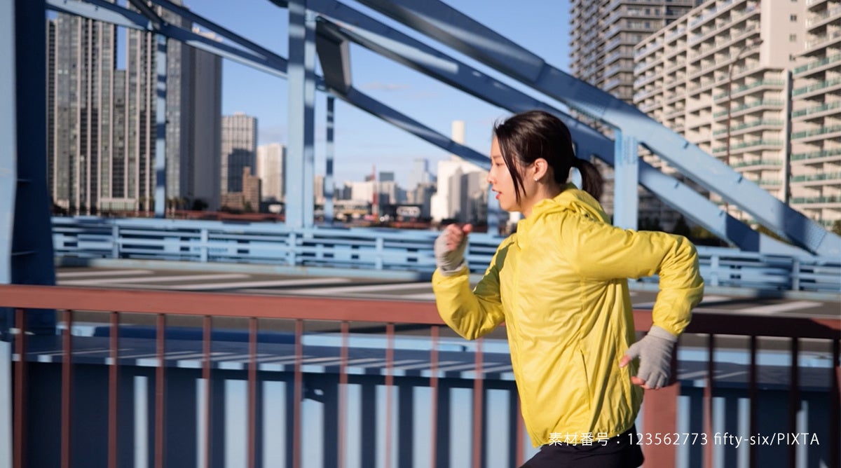 カメラ固定の作品が多い中で、流れゆく街並みと全力で走るランナーのリズムカルな躍動を並走で追うカメラワークは、PIXTAの動画素材の中でも数少ないアプローチです。またこの画角だからこそ、モデルの真剣な眼差しから息づかいまで聴こえてくるようなリアリティが際立って感じられました。