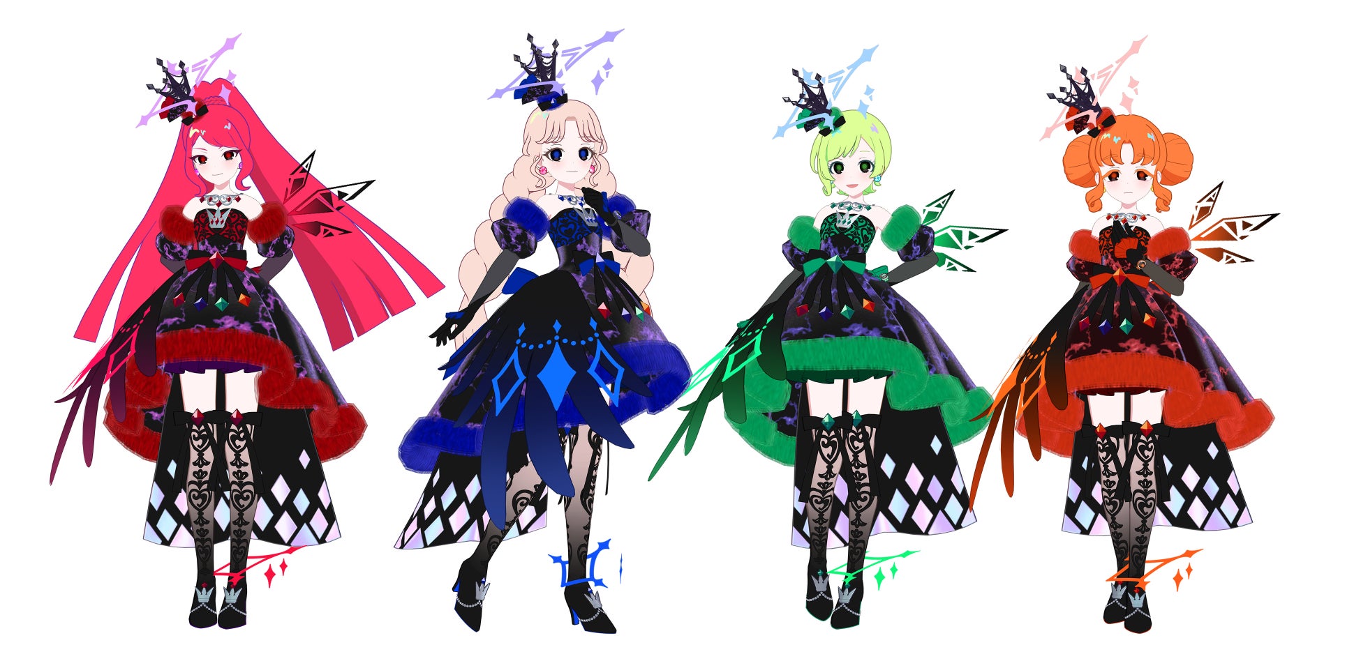 また、ゲーム後にランダムで配出されるコーデには、当時『プリティーリズム・ディアマイフューチャー』のアミューズメントゲームに収録されていたコーデをラインアップするほか、新作コーデとして、 「みあ」のステージ衣装をベースにデザインした「ひみつのディアマイフューチャーコーデ」が2月6日(木)から2種、3月6日(木)から2種、計4種登場します。合わせて「みあ」「れいな」「かりん」「あやみ」の4人がこのコーデを着ているイラストを記念として描き下ろしており、このイラストのグッズが今後「プリズムストーンショップ」でも発売される予定です。