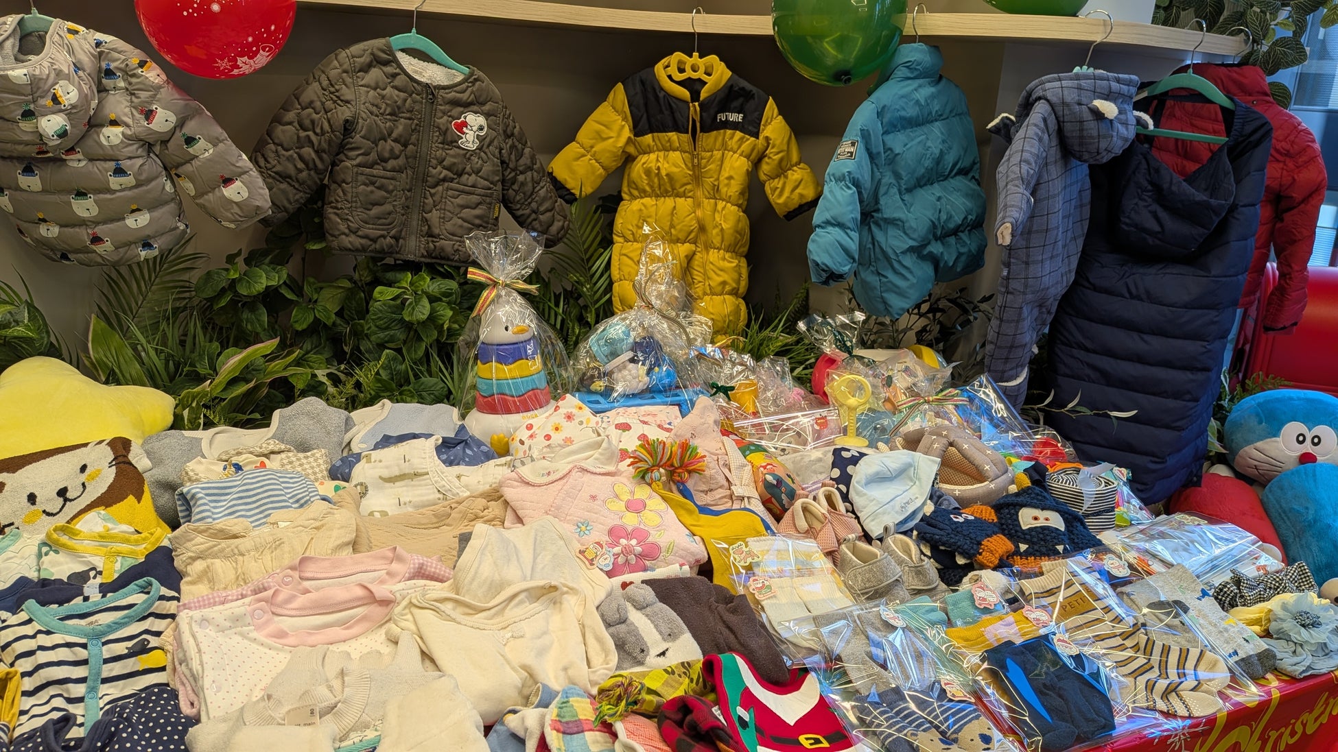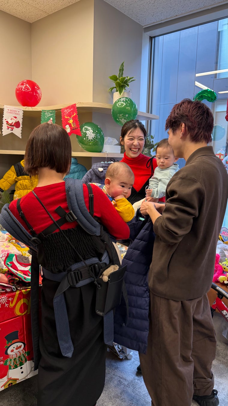 4か月の男の子を連れて参加してくれた育休中のパパ社員とその奥様。この冬しか使わないであろうアイテムを購入しようかどうか迷っていたそう。まさしくそのアイテムを見つけ、短い期間しか使わないものなので、本当に有難いですと喜んでいました。