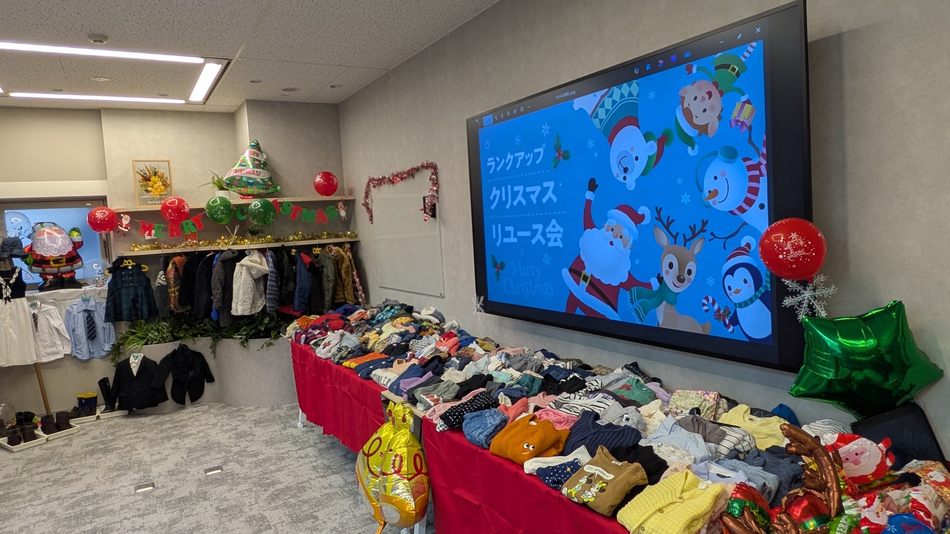 オリジナルブランド「マナラ」「アールオム」「アクナル」を製造・販売する株式会社ランクアップでは、社員の8割が女性、さらに半数が育児をしながら働くママ・パパ社員です。少子化対策に寄与する育児サポートの面でも独自の福利厚生を導入するなど、多数の取り組みを行っています。今年も、子どもが使わなくなったおもちゃや衣類をリユースし、必要としている別の子どもに「お下がりのプレゼント」を提供する社内イベント『継承クリスマス』を2025年12月23日(火)に開催いたしました。昨年に続き、社員の子どもたちからも多くの笑顔が見られ、盛況なイベントとなりました。