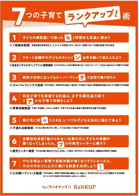 また、2022年には、社内の様々な制度をより積極的に活用し、男女問わず子育てしながら働くことを理解尊重しながら、周囲への罪悪感を感じることなく快適に働いていけるよう、新たに社員育児憲章「7つの子育てランクアップ!術」を制定しています。
