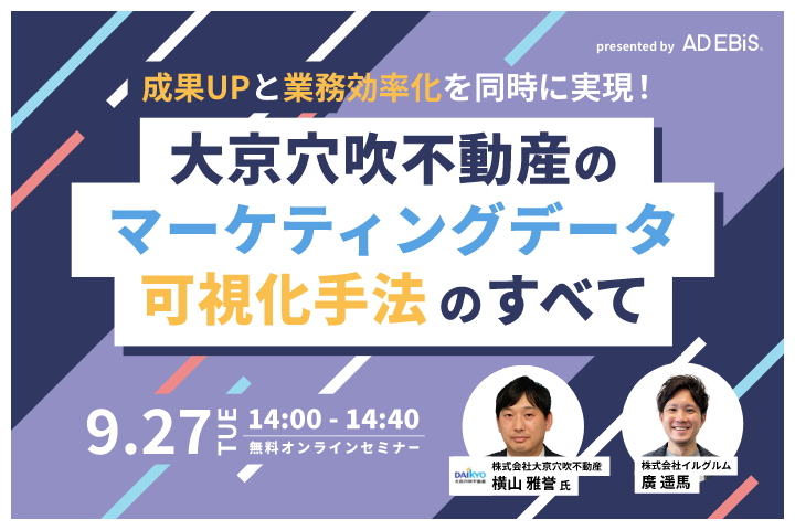 株式会社イルグルム(本社:大阪府大阪市北区 代表取締役:岩田 進、以下「イルグルム」)が提供する広告効果測定プラットフォーム「アドエビス」は、注目企業が取り組んでいるマーケティングデータ活用の裏側に迫る無料オンラインセミナーを2022年9月27日(火)に開催することをお知らせいたします。本セミナーでは、「ライオンズマンション」や「サーパスマンション」ブランドを全国に展開する株式会社大京や株式会社穴吹工務店のグループで、仲介事業を展開している株式会社大京穴吹不動産が行うデジタルプロモーション手法について紹介いたします。