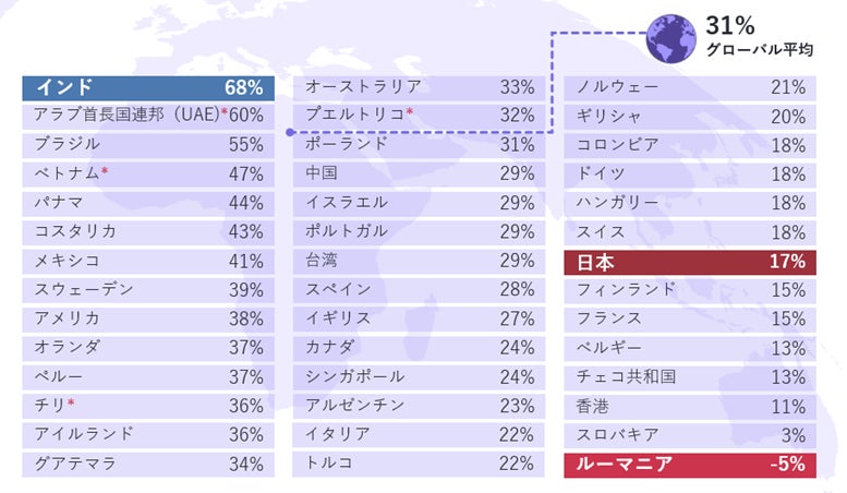 42カ国・地域の純雇用予測:グローバル平均は+31%、日本は+17%