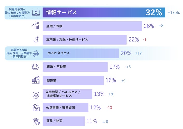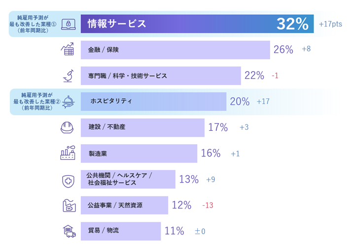 日本国内の業種別調査では、9業種で増員予定となっています。最も活発な雇用活動が期待されるのは「情報サービス」で、前年同期比+17ポイント、純雇用予測は+32%という結果になりました。