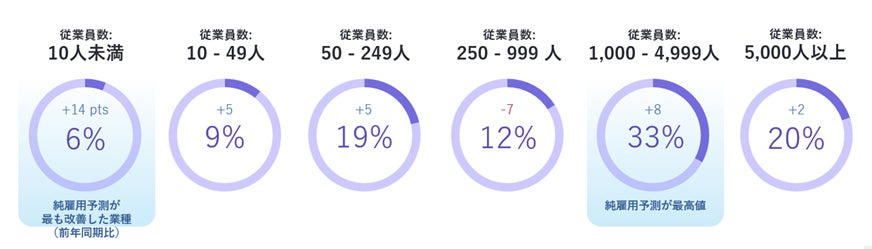 日本国内の組織規模別調査では、すべての組織規模で増員予定でした。「従業員数:1,000-4,999人」の組織が、前年同期比+8ポイントで純雇用予測+33%となり、最も高い雇用予測です。