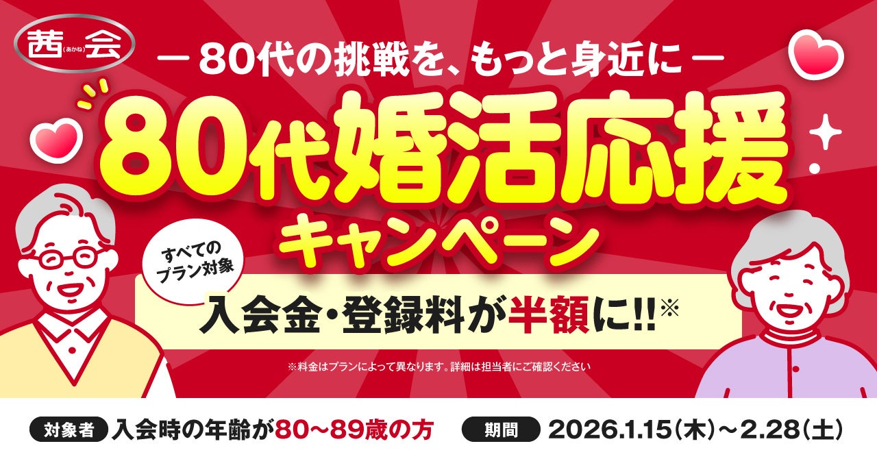 40代から中高年・シニア専門の結婚相談所「茜会」(運営:日本健康管理株式会社、株式会社 トータルマリアージュサポート)は、増加する80代の結婚・パートナー探しのニーズに応えるため、2026年1月15日(木)より 「80代婚活応援 入会金・登録料半額キャンペーン」 を開始いたします。