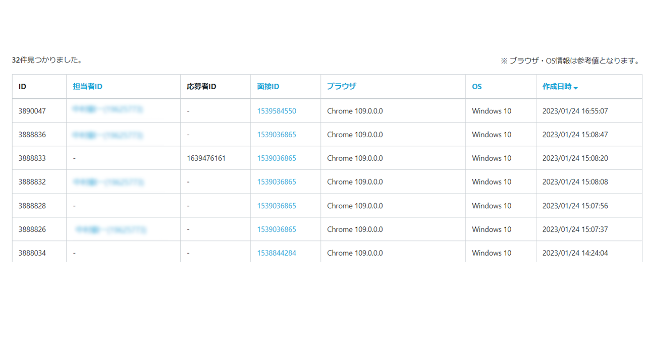 面接担当者と応募者が面接URLにアクセスした時間、ブラウザ(Chrome・Safari)やOS(Windows・Android)等の確認が可能になる機能です。想定される利用シーンは面接開始時間になっても応募者が面接に入られない際に、応募者が面接URLにアクセスしているかどうかの確認を行うことができます。また面接実施が出来なかった際に動作環境が対応していたのかを確認し、そうでない場合は応募者に対応するブラウザ(環境)でアクセスするように案内することで面接実施率を高めることにも繋がります。