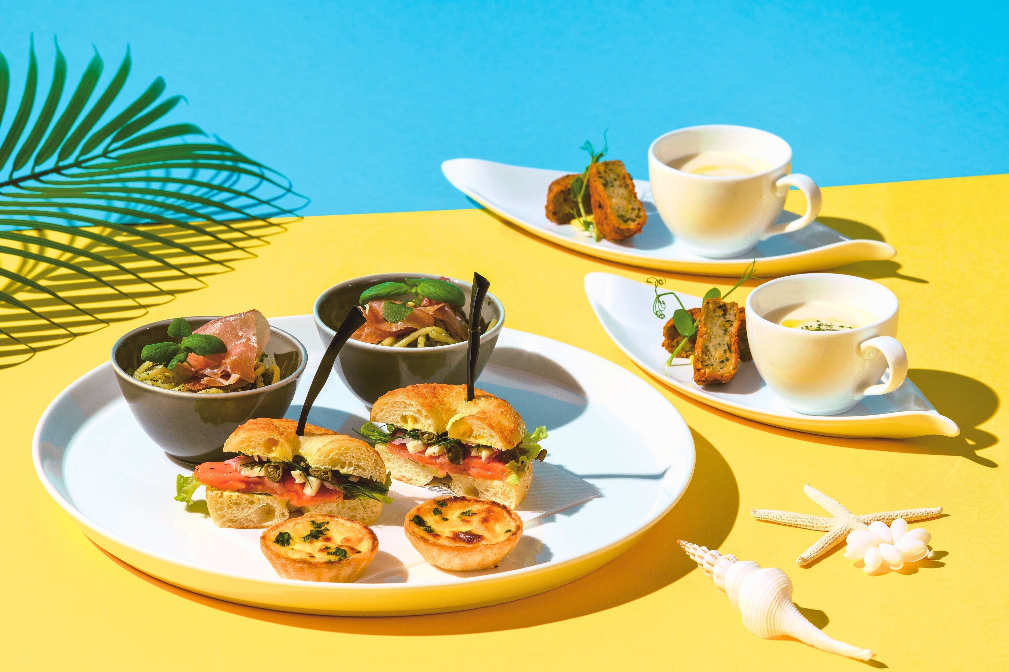 アミューズブーシュ「ひとくちのお楽しみ」/冷製カッペリーニ/ミニベーグルサンド/ベーコンとオニオンのプチキッシュ/本日のスープ