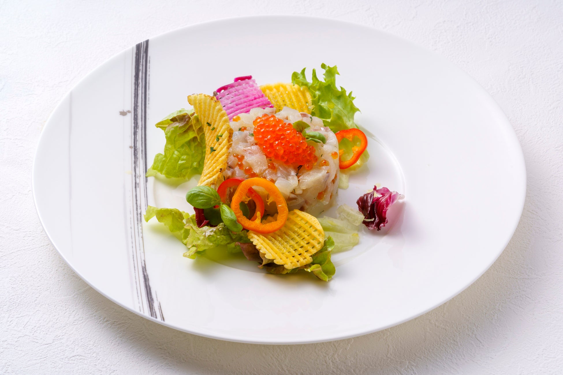 新鮮な魚を使用したタルタルは、口の中で広がるハーブの豊な風味が特徴です。また、カリッと焼き上げたポテトゴーフレットは、サクサクとした食感が楽しめます。野菜サラダを添えることで、彩りも豊かになり、ヘルシーなメニューに仕上げました。