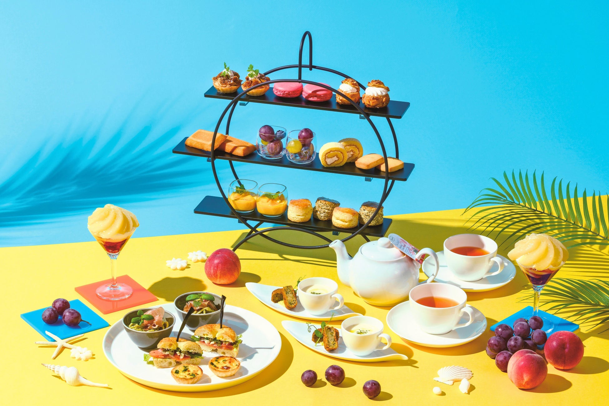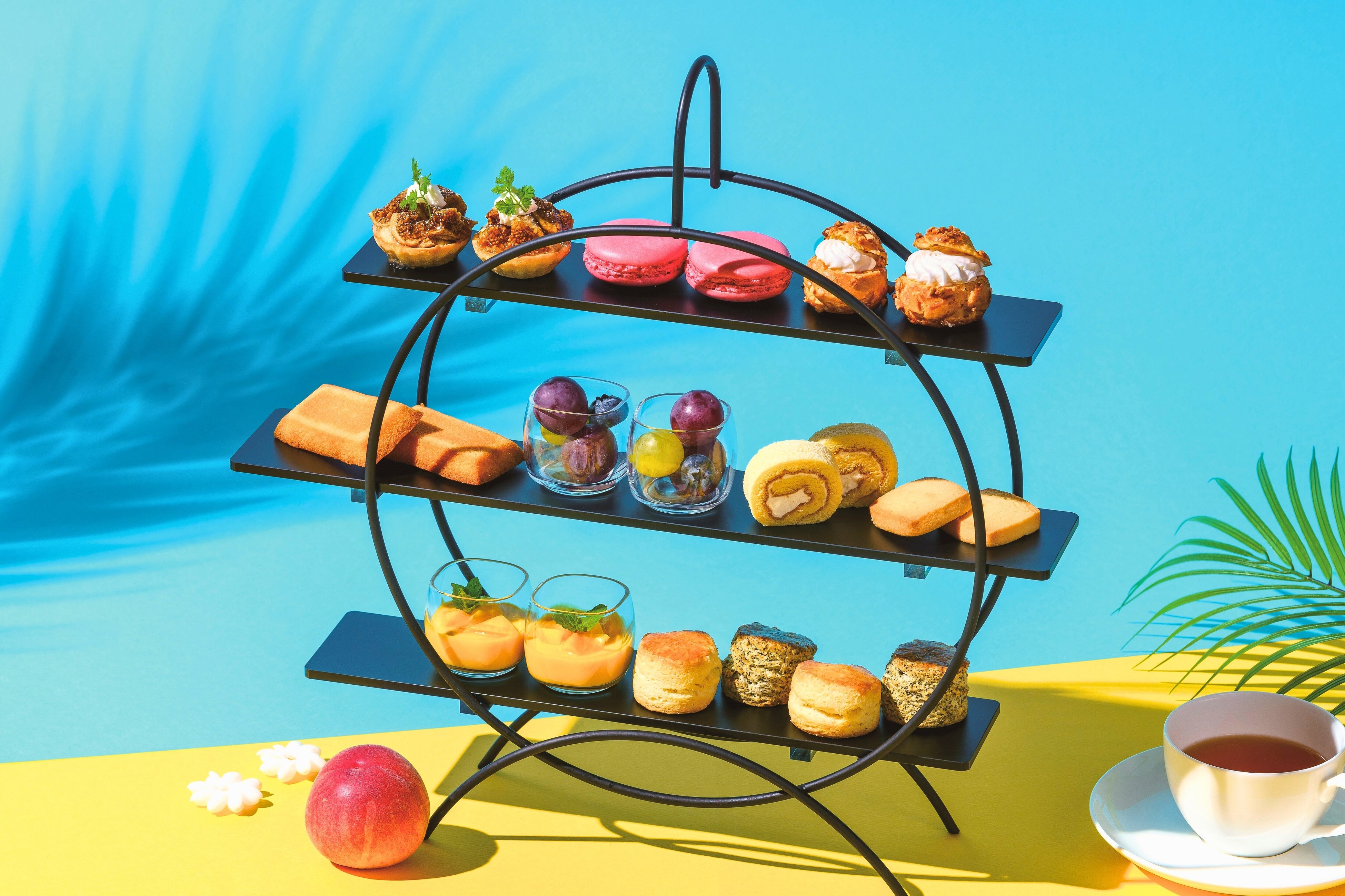 桃やマンゴー、イチジクなど夏に旬を迎える季節の果物を主役に、アフタヌーンティーをご提供します。果肉をたっぷりと使用した桃のプチパフェやクリーミーな口どけのマンゴープリンなど、旬のフルーツのフレッシュさを活かした爽やかな味わいに仕上げ、晴れやかな青空が広がる夏の高揚感を表現しました。心躍る夏のティータイムをお過ごしください。