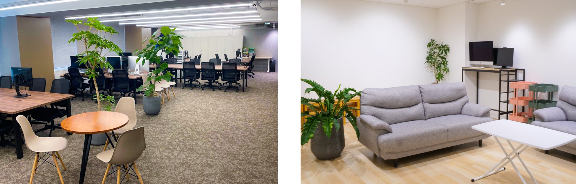 新本社は明るく暖かみのある内装で、2つのスタジオは、撮影や編集作業の有無に関わらず、クリエイターが集い、リラックスして自由に過ごせるように空間設計しました。また、執務エリアには植物や丸テーブルを設置し、社員同士や社員とクリエイターが、気軽にコミュニケーションをとれるような環境づくりを目指しました。