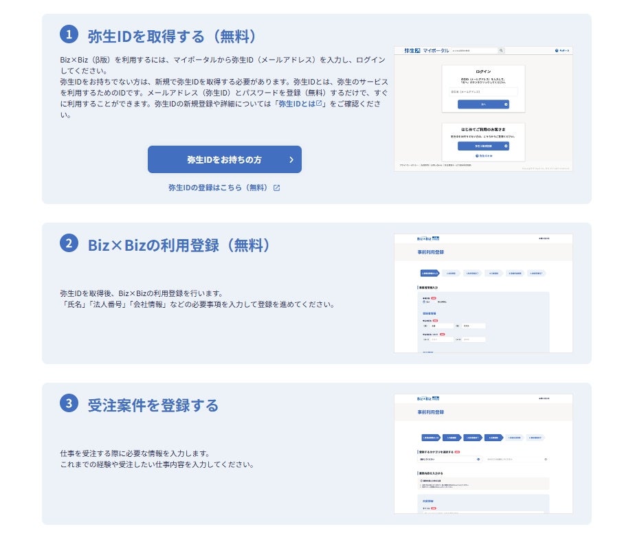 弥生IDを取得し、「Biz×Biz(β版)」のサービスサイトから利用登録と受注案件の登録をします。