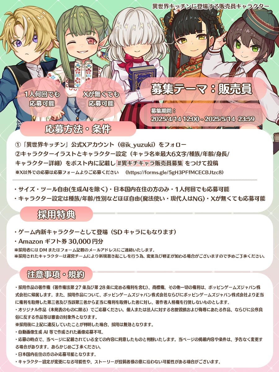 ポッピンゲームズジャパン株式会社が開発する、Android/iOS向けスマートフォンゲーム『異世界キッチン 行列のできる現代料理のお店』は、公式Xアカウントにてキャラクターデザインの募集を行う事を発表いたします。