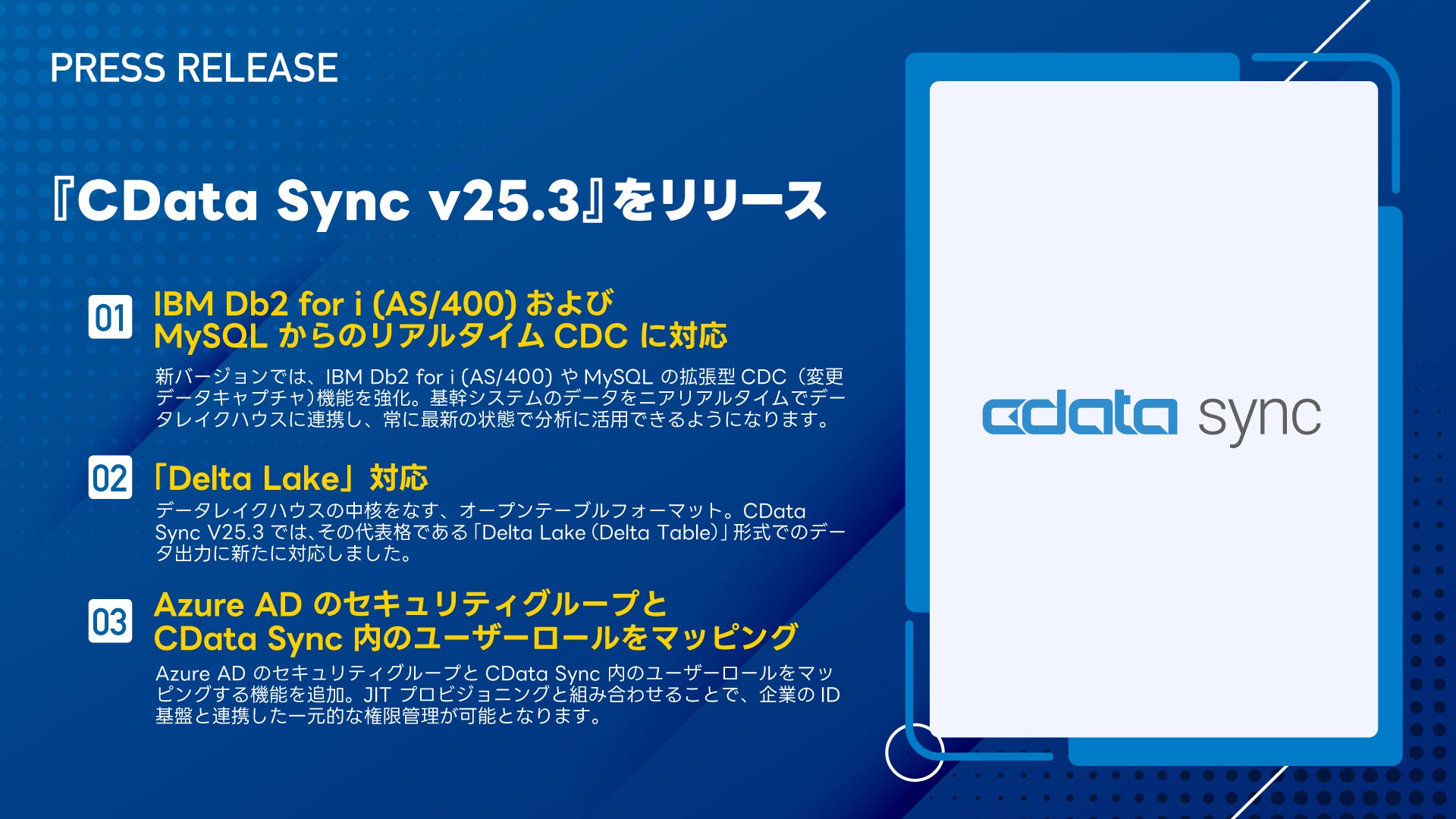 2025年10月15日、リアルタイムデータ連携コネクタを提供するCData Software Japan 合同会社(本社:アメリカノースカロライナ州、日本オフィス:宮城県仙台市、代表社員 職務執行者:疋田 圭介、以下CData)は、400種類以上のSaaS・DB データをノーコードでETL / ELT 可能な『CData Sync』の新バージョン、V25.3をリリースしました。