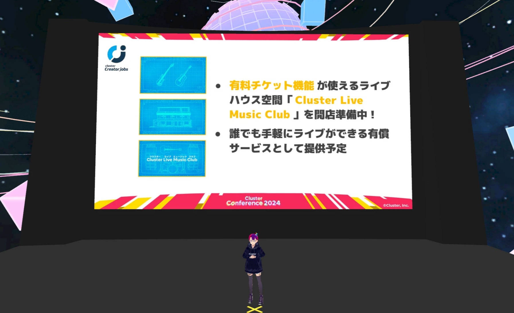 手軽にバーチャルライブを開催し、有料チケット機能が使えるライブハウス空間「Cluster Live Music Club 」を提供いたします。近日プレオープン予定となりますので、続報までしばしお待ちください。