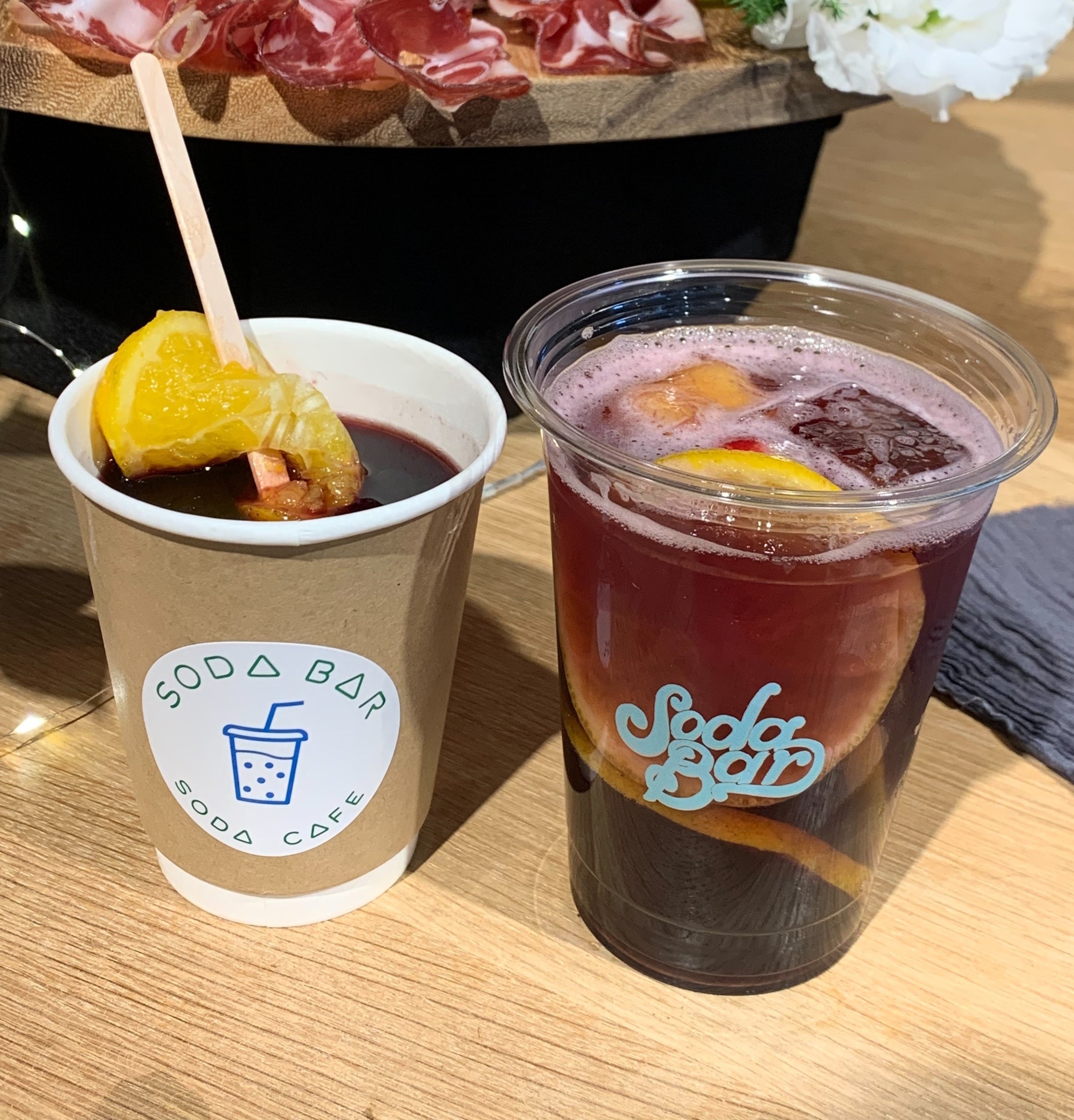 横浜店限定ですっきりとした赤ワインのフルーツカクテルソーダや体の中から温まるオリジナルHOTサングリアも販売中。カクテルやHOTサングリアの串に刺したフルーツのシロップ漬けは無農薬のフルーツなので皮ごと食べられます。