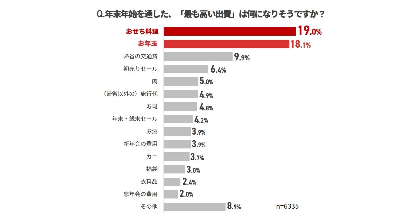 年末年始を通した最も高い出費を聞いてみました。「おせち料理」が19.0%でトップでした。昨年も同様に1位でしたが、イクラ、かずのこ、タコといった海産物、伊達巻などの材料となる卵など、おせち料理を彩る食材の高騰が相次いでいることもあってか、今年もトップとなりました。2位は「お年玉」(18.1%)です。