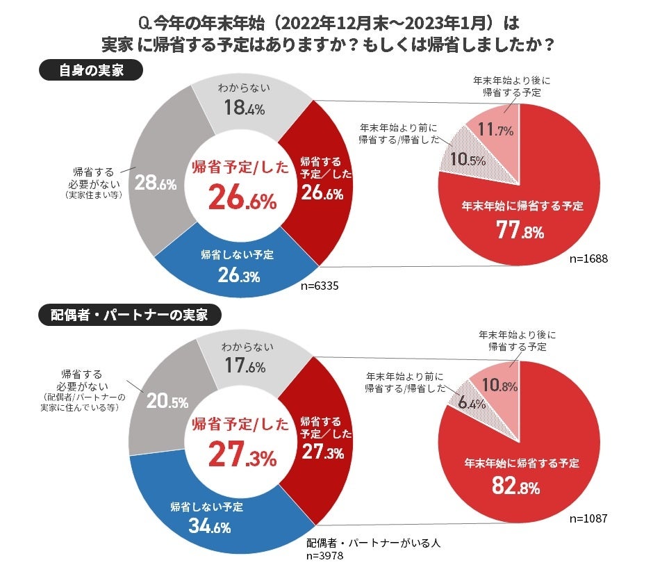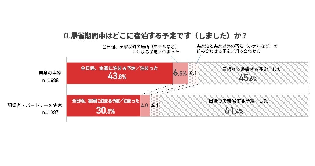 一方で、「日帰りで帰省する予定・した」人は自身の実家では45.6%でしたが、配偶者・パートナーの実家では61.4%という結果となりました。