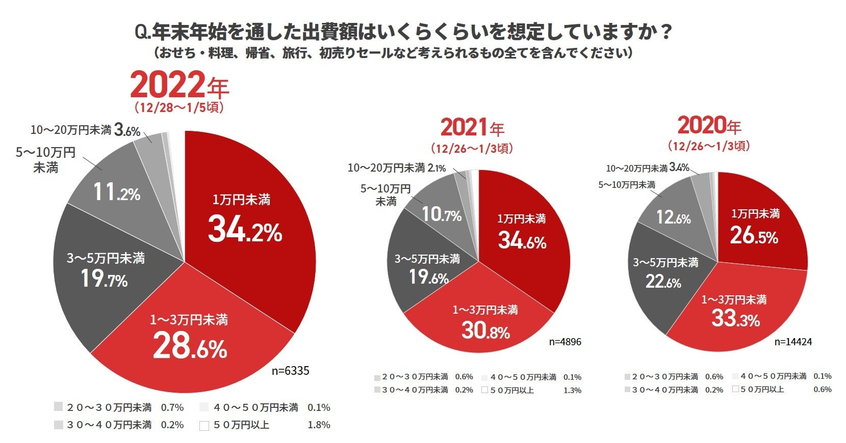 年末年始を通した出費額について聞いてみました。「1万円未満」が34.2%でトップ、ついで「1~3万円未満」が28.6%、「3~5万円未満」が19.7%という結果でした。昨年2021年の結果と大きく変わることはなく低予算化の傾向が見て取れます。
