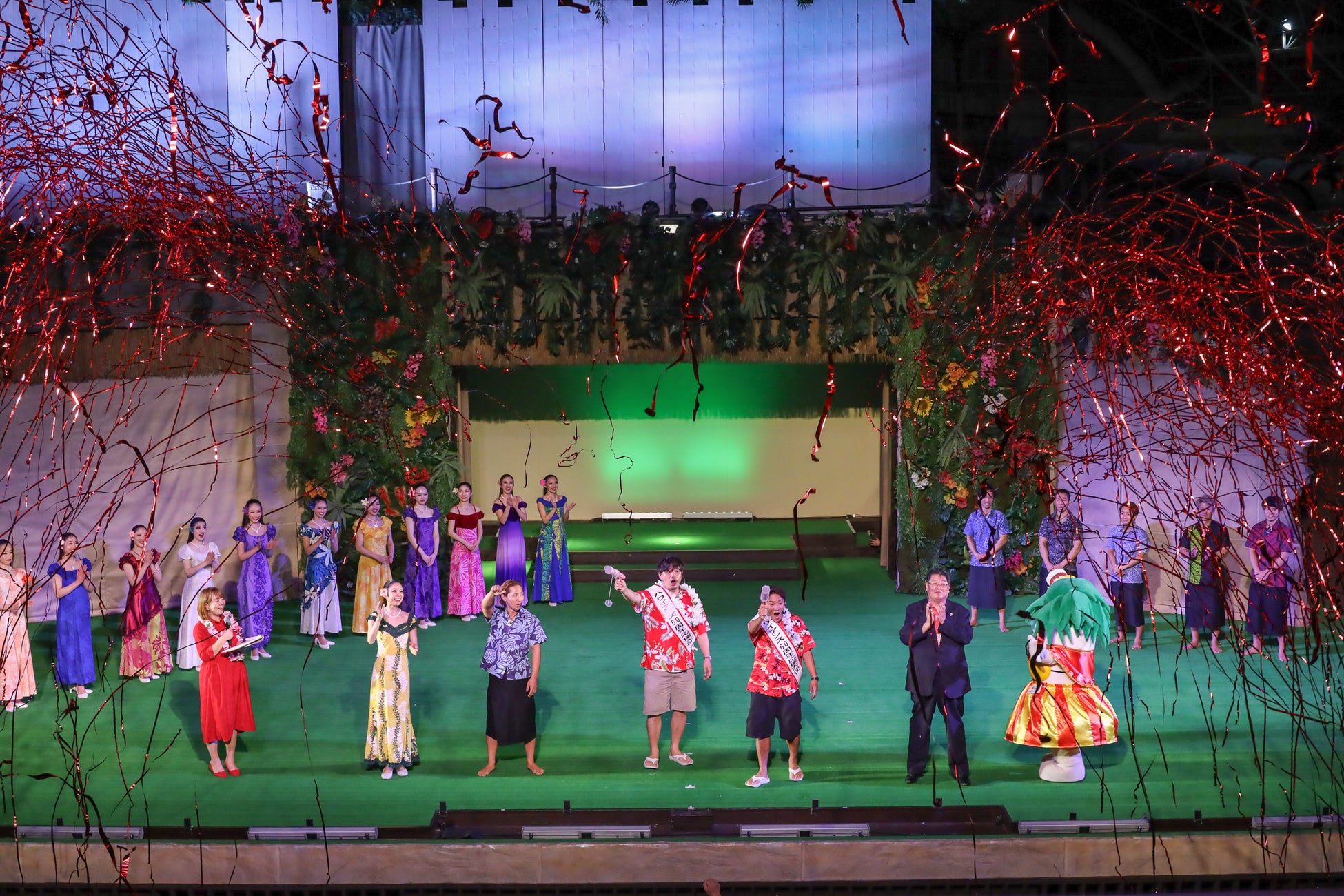 最後に、「アルコ&ピース」の二人の掛け声のもと、会場のお客様と一緒に全員で、「ハワイアンズ還暦祭~、スタート!」と声を上げました。ハワイアンズ還暦祭のイメージカラーである“赤”のリボンが弾け飛ぶクラッカーを鳴らして一層華やかなステージを演出し、セレモニーの結びといたしました。