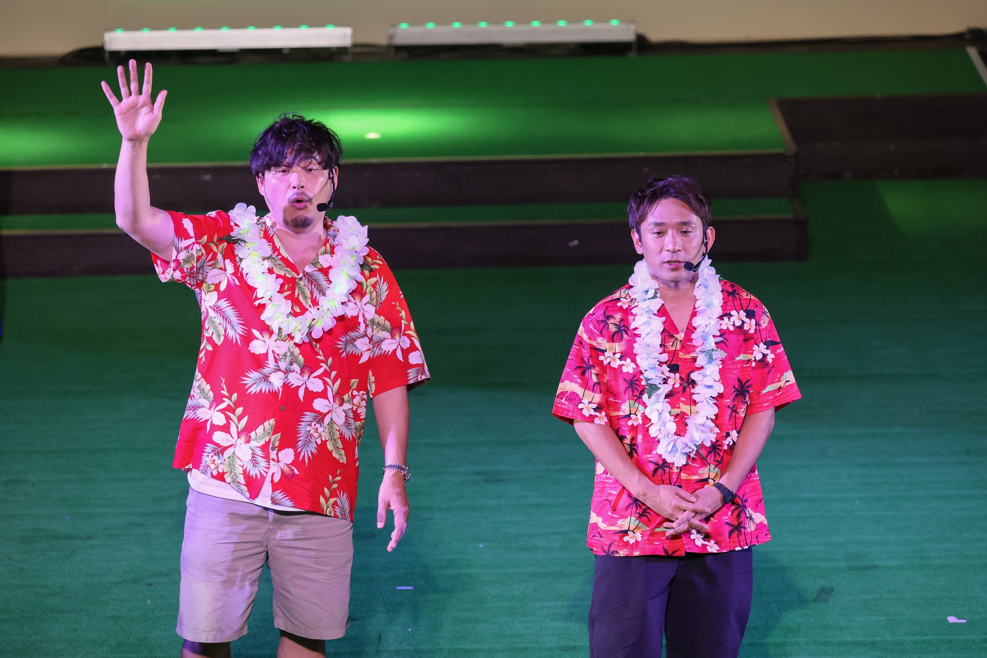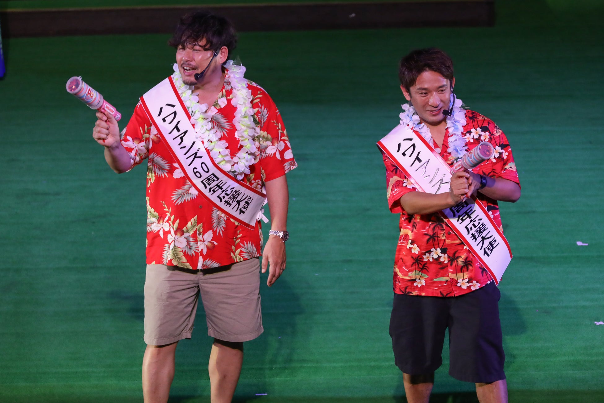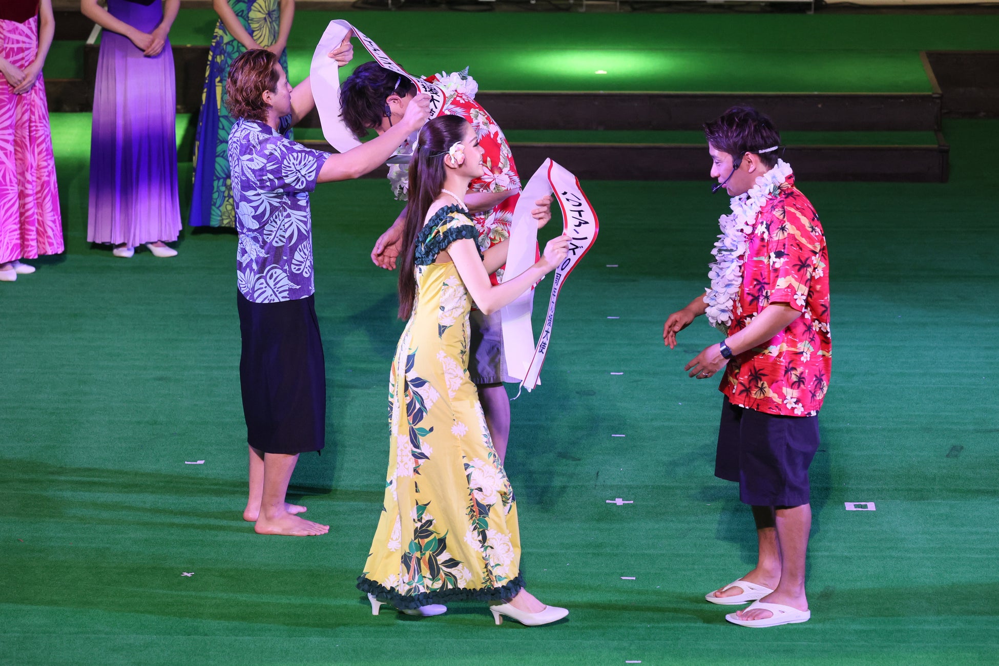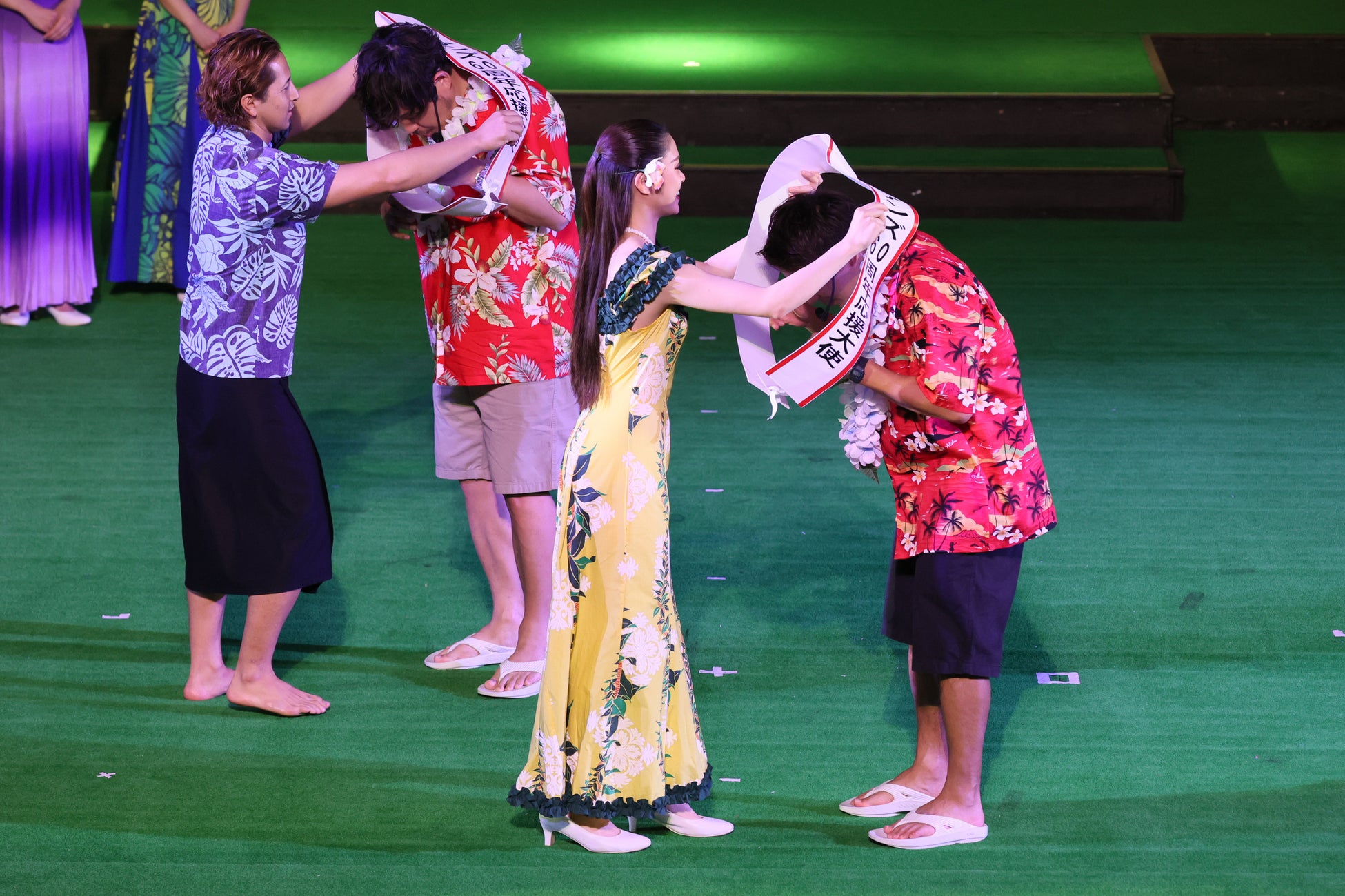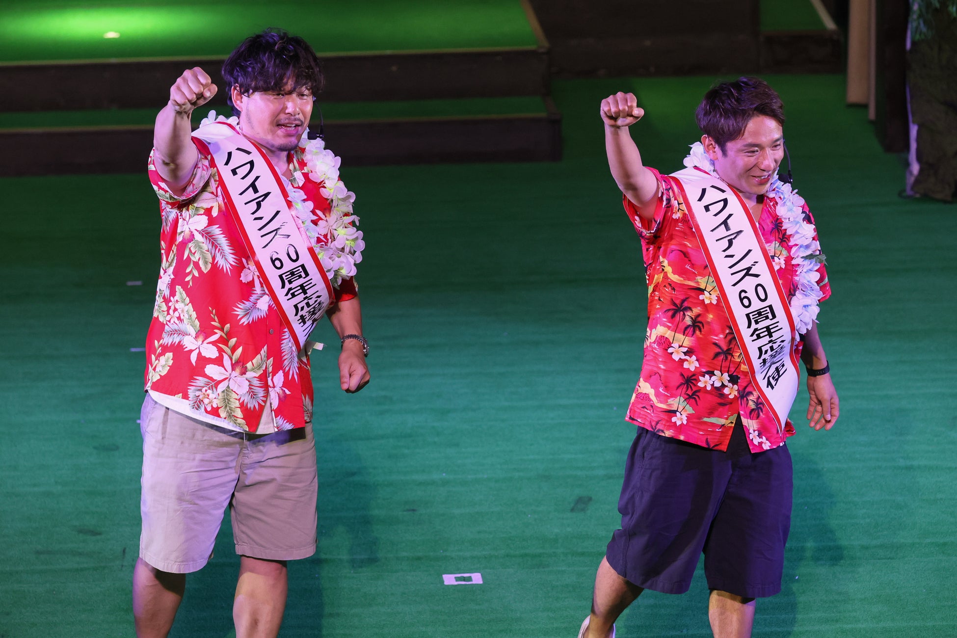 続いて、ハワイアンズダンシングチームのフラガールとファイヤーナイフダンスチーム「シバオラ」のメンバーも舞台上に現れます。フラガールサブキャプテンのプアメリア真由と、ファイヤーナイフダンスチーム「シバオラ」のリーダー・ジンLEONから、「アルコ&ピース」の二人に「ハワイアンズ創業60周年応援大使」のたすきを授与しました。たすきを授与された平子さんは「小さいころから足しげく通ったハワイアンズ。素晴らしい施設なので、日本全国、アジア、そして世界にまで、ハワイアンズが広まるように、今日会場に来ていただいた皆さんと一緒に発信していきたい」と意気込みを述べました。