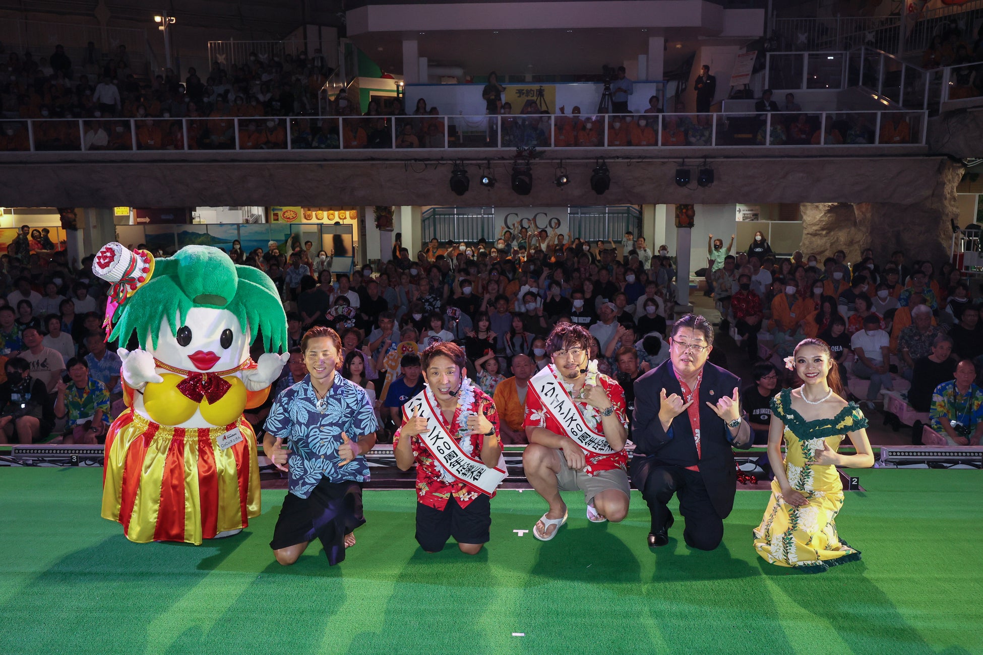 その後、応援大使の「アルコ&ピース」が登場すると、会場のお客様からは大きな拍手と歓声があがりました。ハワイアンズがある福島県いわき市出身の平子祐希さんと、その相方の酒井健太さんは、「福島県いわき市小名浜出身の平子です!」「川崎出身で平子のバーターできました、酒井です!(笑)」と自己紹介。「赤ちゃんの頃から家族で年間パスポートを持って“常磐ハワイアンセンター”(当時の施設名)に遊びに来ていました」という平子さん。会場のお客様に今日どこから来たのか問いかけると、福島県内だけでなく、県外からも多くのお越しいただいていることがわかり感激の様子でした。また、司会からハワイアンズ還暦祭の限定フードでお勧めを聞かれると、平子さんが「(露天風呂のある)与市で食べられる赤いお蕎麦」、酒井さんが「甘い赤いベリーのパンケーキ」と紹介いただきました。ハワイアンズ還暦祭を記念してオリジナルキャラクター「CoCoネェさん」ラベルのペットボトルの水も販売されることを司会が補足すると「社長は商売上手なんだから!」とツッコんで、会場の笑いを誘いました。