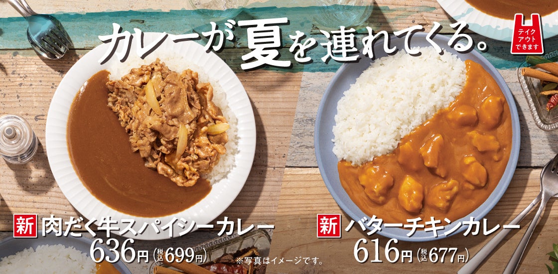 株式会社吉野家(本社:東京都中央区、代表取締役社長:河村泰貴、以下吉野家)は、5月2日(木)11時より全国の吉野家店舗※で新商品『バターチキンカレー』本体価格616円(税込677円)と、商品設計をリニューアルした『肉だく牛スパイシーカレー』本体価格636円(税込699円)の販売を開始します。いずれもテイクアウト可能です。