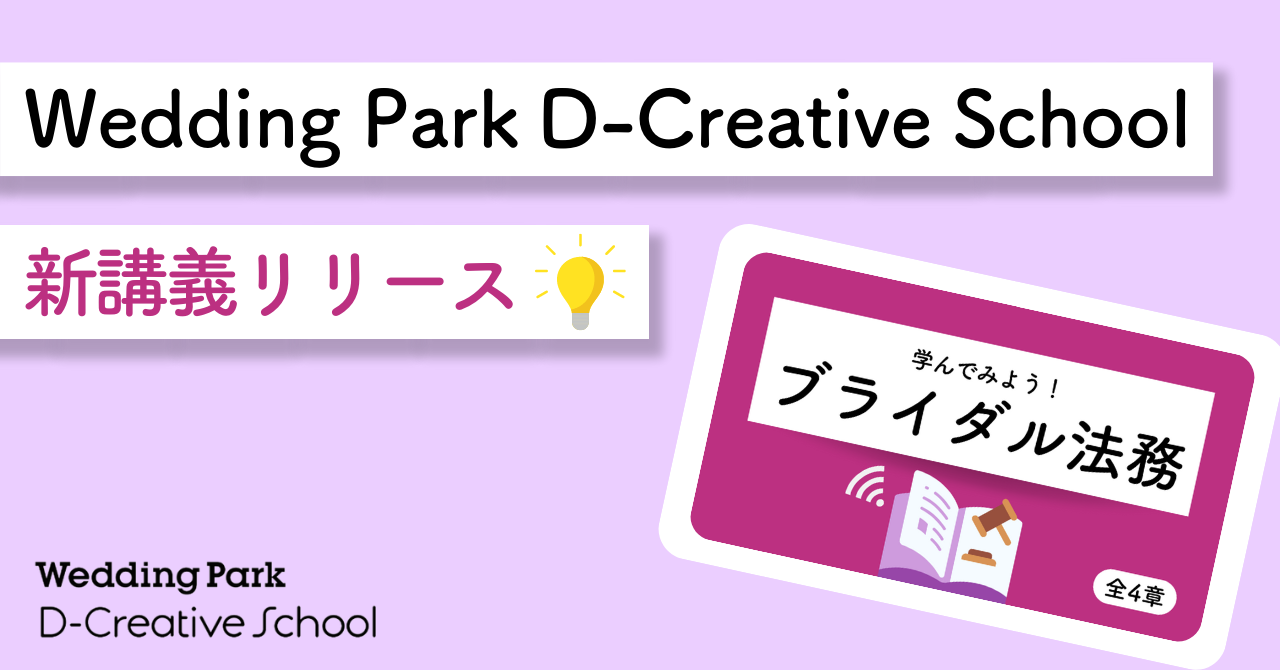 株式会社ウエディングパーク(本社:東京都港区、代表取締役社長:日紫喜 誠吾)が実施する、ウエディング業界にデジタルスキルを中心とした学習環境を提供するプロジェクト「Wedding Park D-Creative School(略称:Dクリ)」は、公式noteにて新しい講義動画「ブライダル法務」を本日リリースいたしました。