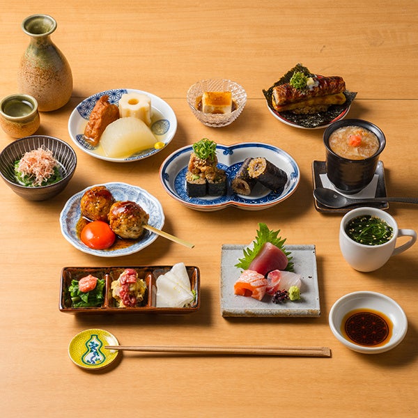 あごだしの原料であるトビウオは、海上を飛ぶように泳ぐため、雑味の原因になる脂肪分が他の魚より少なく、スッキリとした上品な味のお出汁が取れます。焼くことで旨味が凝縮され、香ばしい香りもまとった深みのあるお出汁になり、季節を問わずお楽しみいただけます。定番のラインナップ以外にも、旬の食材を使用した季節限定メニューを揃えています。1品100円(税込110円)〜