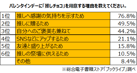 「その他」の回答としては、「素敵な作品を生み出してくださった作者の先生へ感謝を示すため」「作品の人気の後押し」「推しへの恋心」「推しへのプレゼントというより、“推しから貰った”という体のチョコを毎年購入。この推しならどんなチョコを選ぶかな?と考えるのが楽しい」などの声が寄せられました。