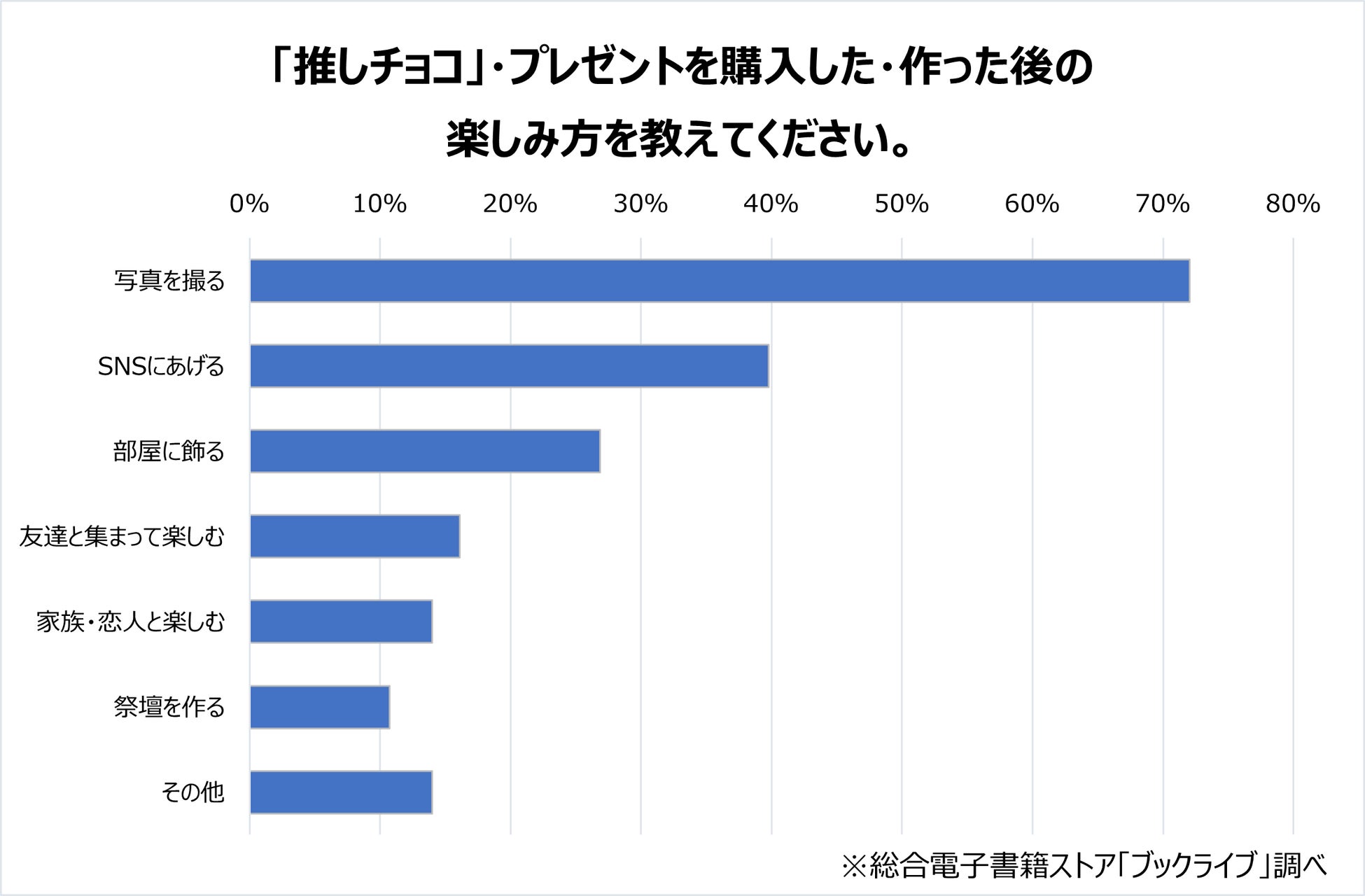 「推しチョコ・プレゼントを購入した・作った後の楽しみ方を教えてください。」という質問に対しては1位「写真を撮る」72.0%、2位「SNSにあげる」39.8%、3位「部屋に飾る」26.9%という結果となり、「友達と集まって楽しむ」「家族・恋人と楽しむ」という回答を上回りました。