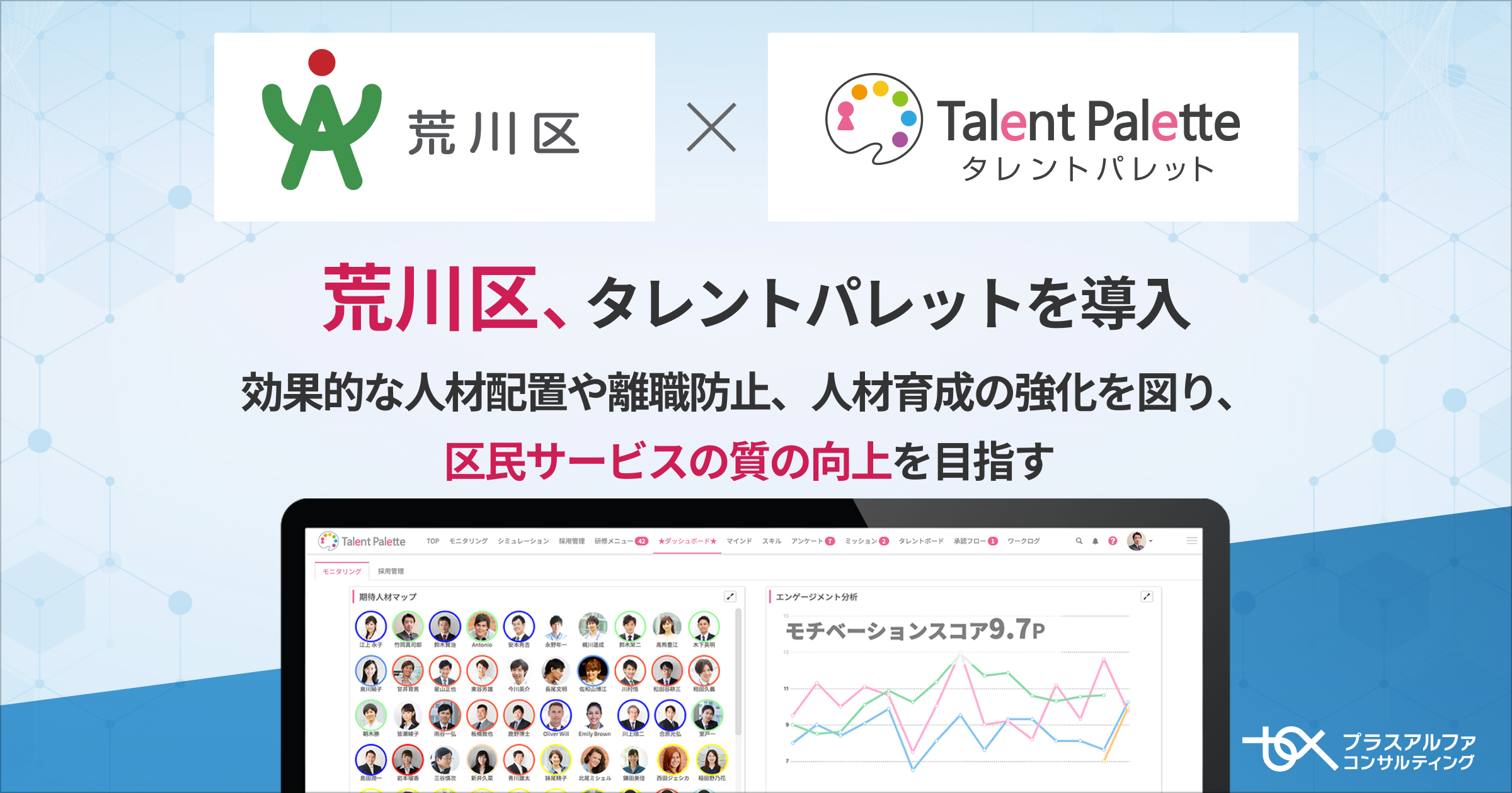 株式会社プラスアルファ・コンサルティング(本社:東京都港区、代表取締役社長:三室克哉 証券コード:4071)は、データに基づく人材活用や人的資本経営の実践、人事業務のDX化、リスキリングの推進などを目的に、多くの大手・エンタープライズ企業で導入が進むシェアNo.1(*)のタレントマネジメントシステム「Talent Palette(以下:タレントパレット)」を東京都荒川区(区長:滝口 学、以下:荒川区)に導入いただきましたことをお知らせします。