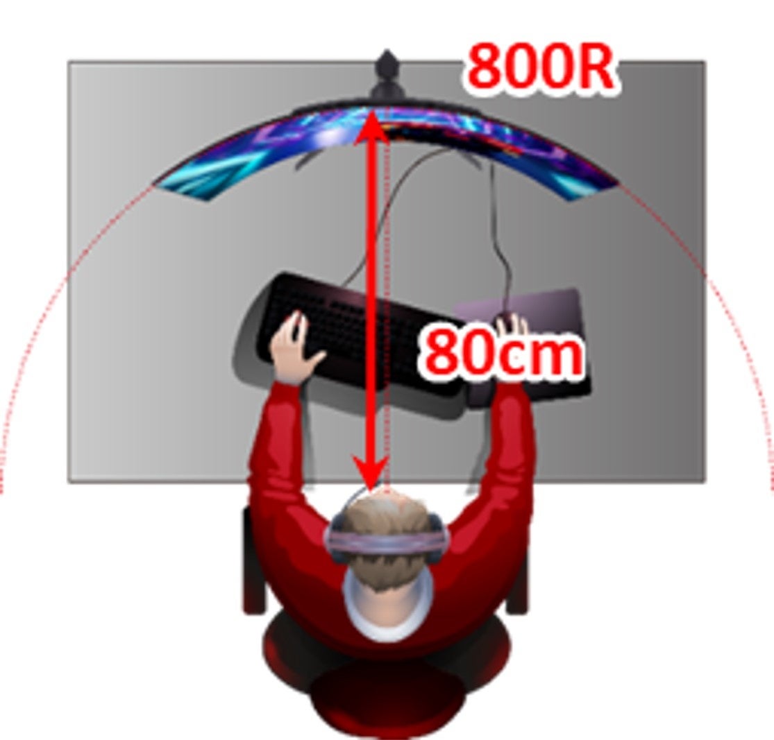 より人間の視界に近く、曲率800R(半径80cm)の画面がまるで包み込むような映像体験と臨場感を演出します。