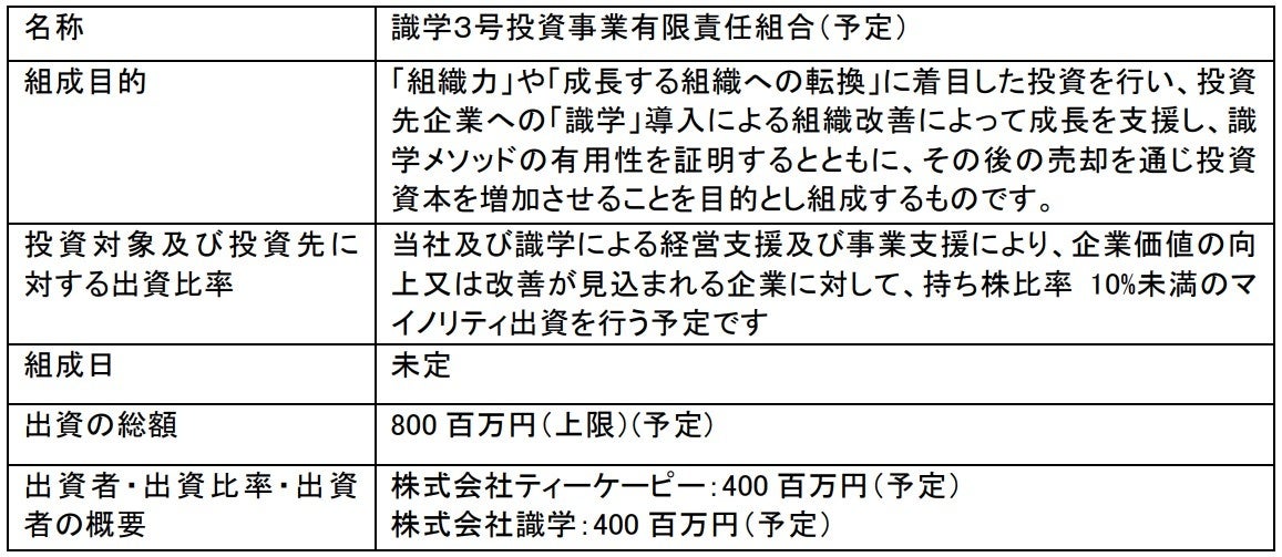 TKPは、販売提携や、識学グループが有するハンズオン支援ファンド・VCファンド事業におけるノウハウ・リソースの共有を目的として、識学と資本業務提携契約を締結しており、販売提携においては4月20日より企画開始することが決定しております。両社の経験と強みを活かし、企業価値向上に向けた協業を進める中で、共同ファンドの組成について前向きに検討を行うことになったため、基本合意書の締結にいたりました。