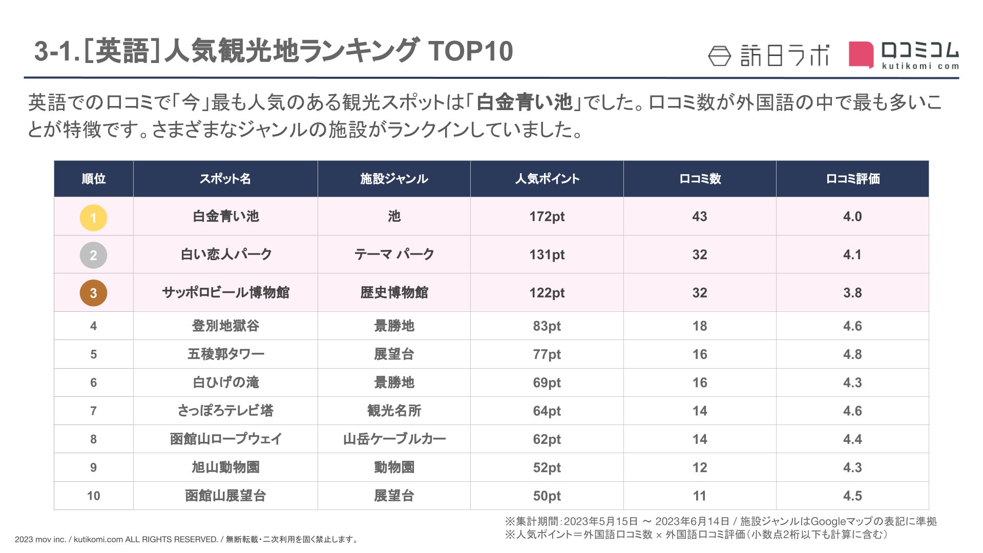 英語での口コミで「今」最も人気のある観光スポットは「白金青い池」でした。口コミ数が外国語の中で最も多いことが特徴です。さまざまなジャンルの施設がランクインしていました。